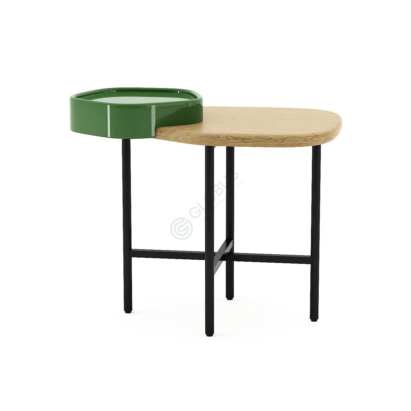 Стильный журнальный столик объединяет лаконичную эстетику и функциональность, дополняя современное пространство гостиной. Натуральный шпон придаёт столешнице теплый, спокойный оттенок, создавая уютный акцент в интерьере. Встроенный элемент контрастного зелёного цвета добавляет свежести и оригинальности, одновременно обеспечивая удобство для небольших предметов.