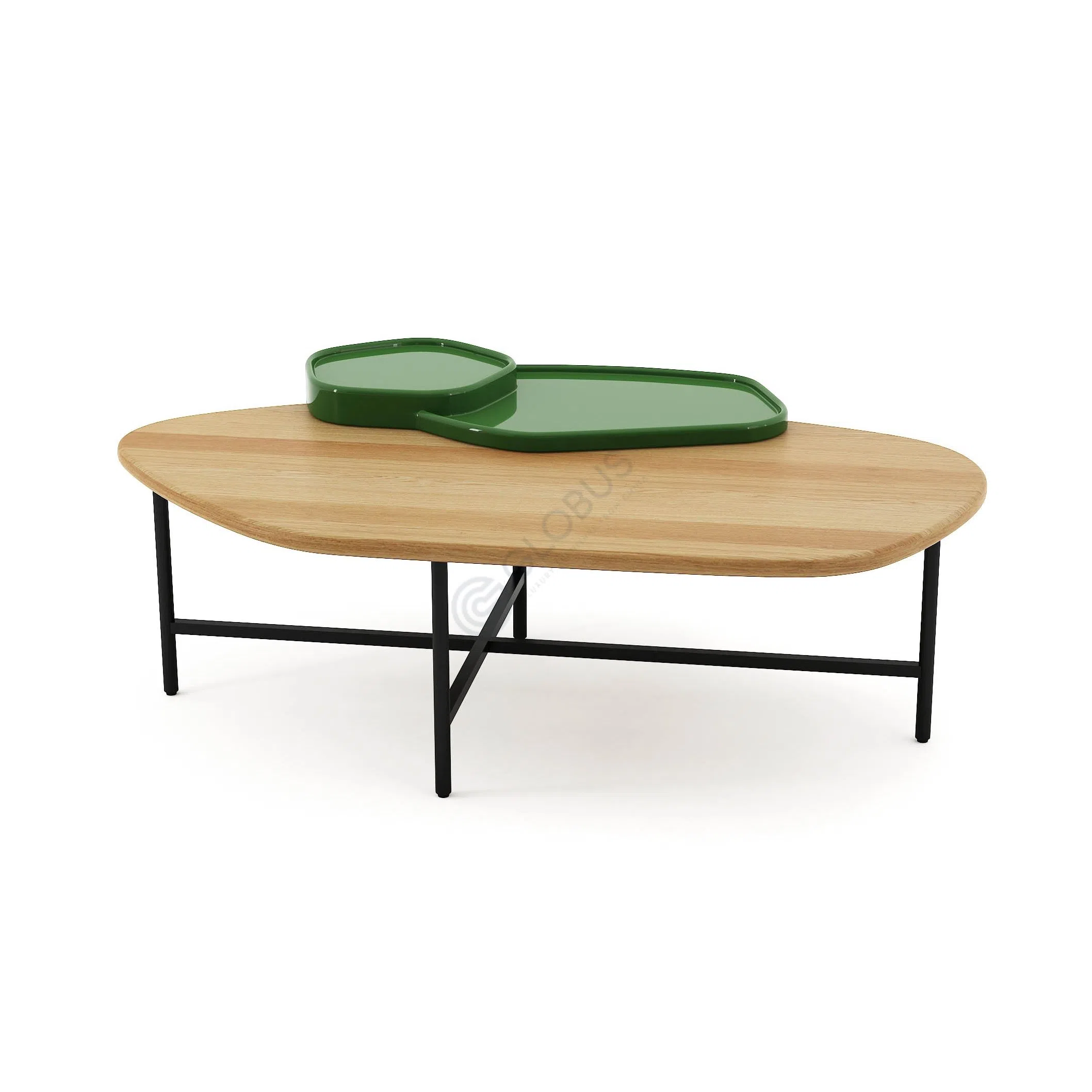 Столешница выполнена из шпона и МДФ, что подчеркивает текстуру натуральных материалов, при этом обеспечивая долговечность и простоту ухода. Дополнительный акцент в виде лакированной зеленой секции выделяет модель среди других и добавляет характер.