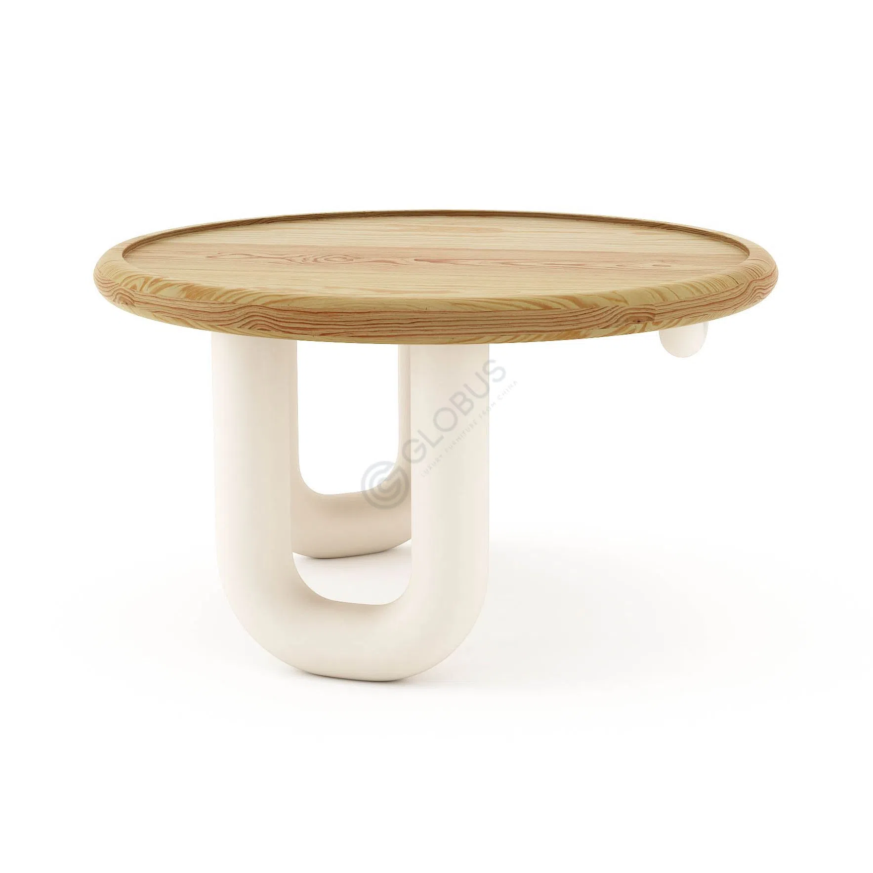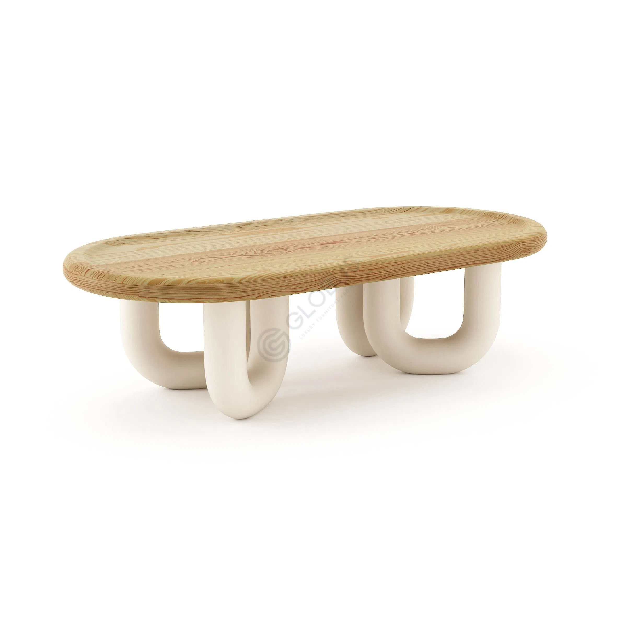 Мягкие закругленные формы столешницы из древесины акцентируют уют и натуральную текстуру, создавая гармонию в интерьере. Опоры уникальной формы выполнены в светлом оттенке, что добавляет конструкции стабильность и непринужденное изящество.