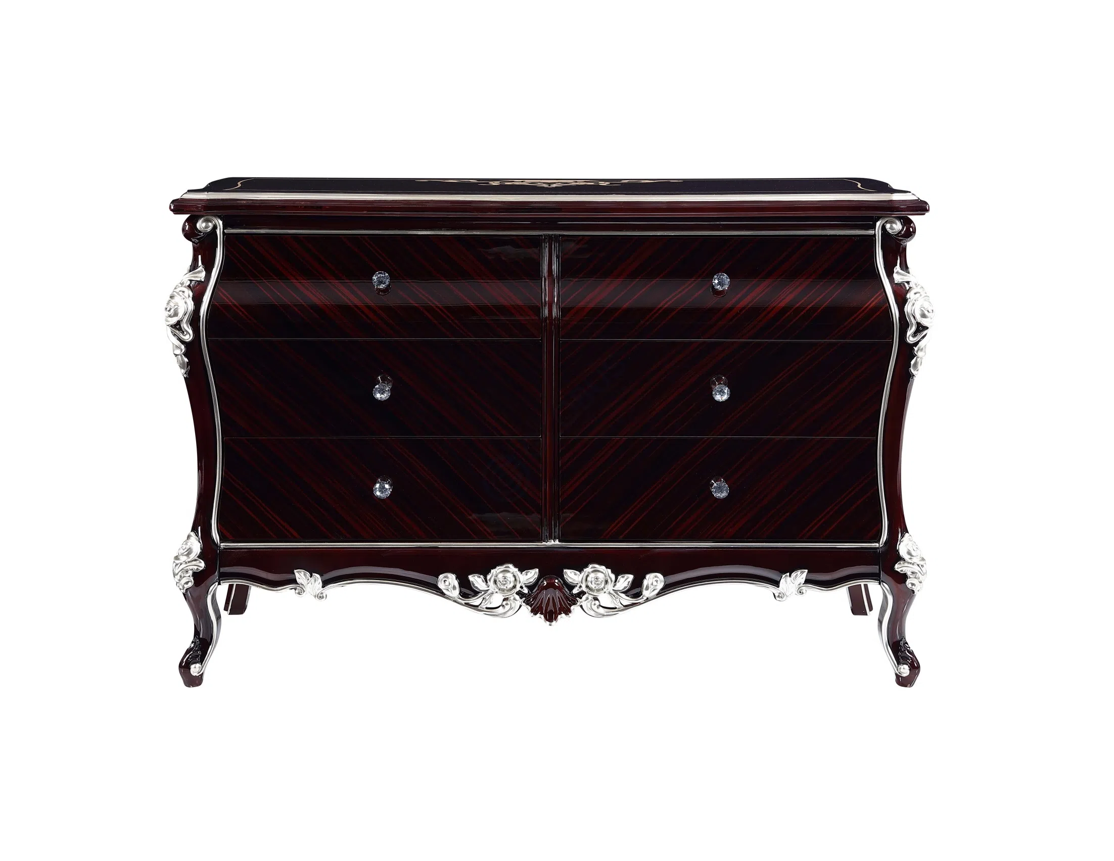 Дизайн отличают плавные, изогнутые линии фасада и ножек, характерные для классического стиля. Декоративная резьба, выполненная с большим мастерством, украшает нижнюю часть и опоры, а центральный утонченный орнамент становится выразительным акцентом на фронтальной части, придавая предмету особую индивидуальность. Фурнитура завершает элегантный образ.
