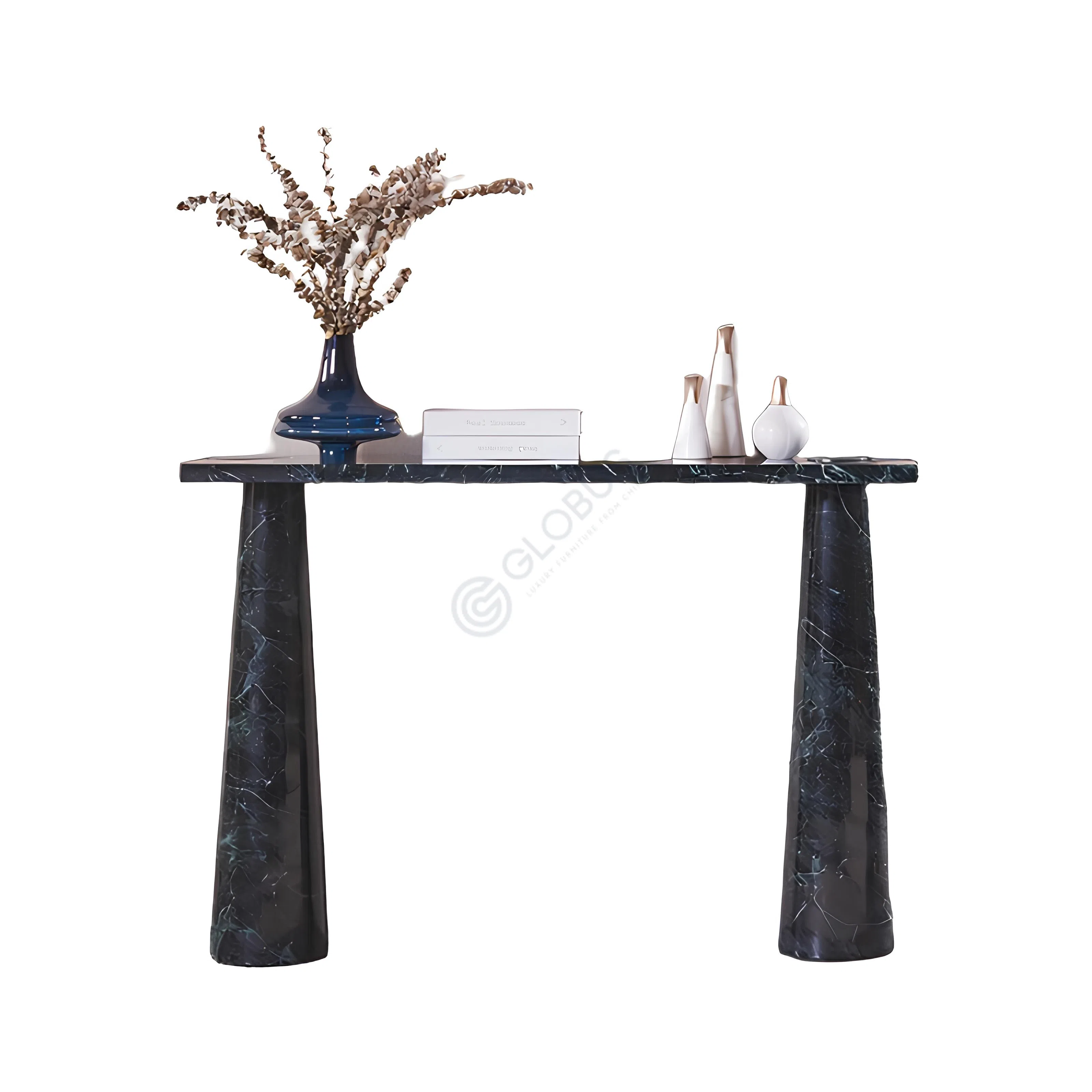 Столешница и массивные опоры выполнены из натурального мрамора. Этот материал придает предмету неповторимую элегантность и ощущение прочности. Естественный узор прожилок на полированной поверхности делает каждый столик уникальным произведением природы и мастерства.