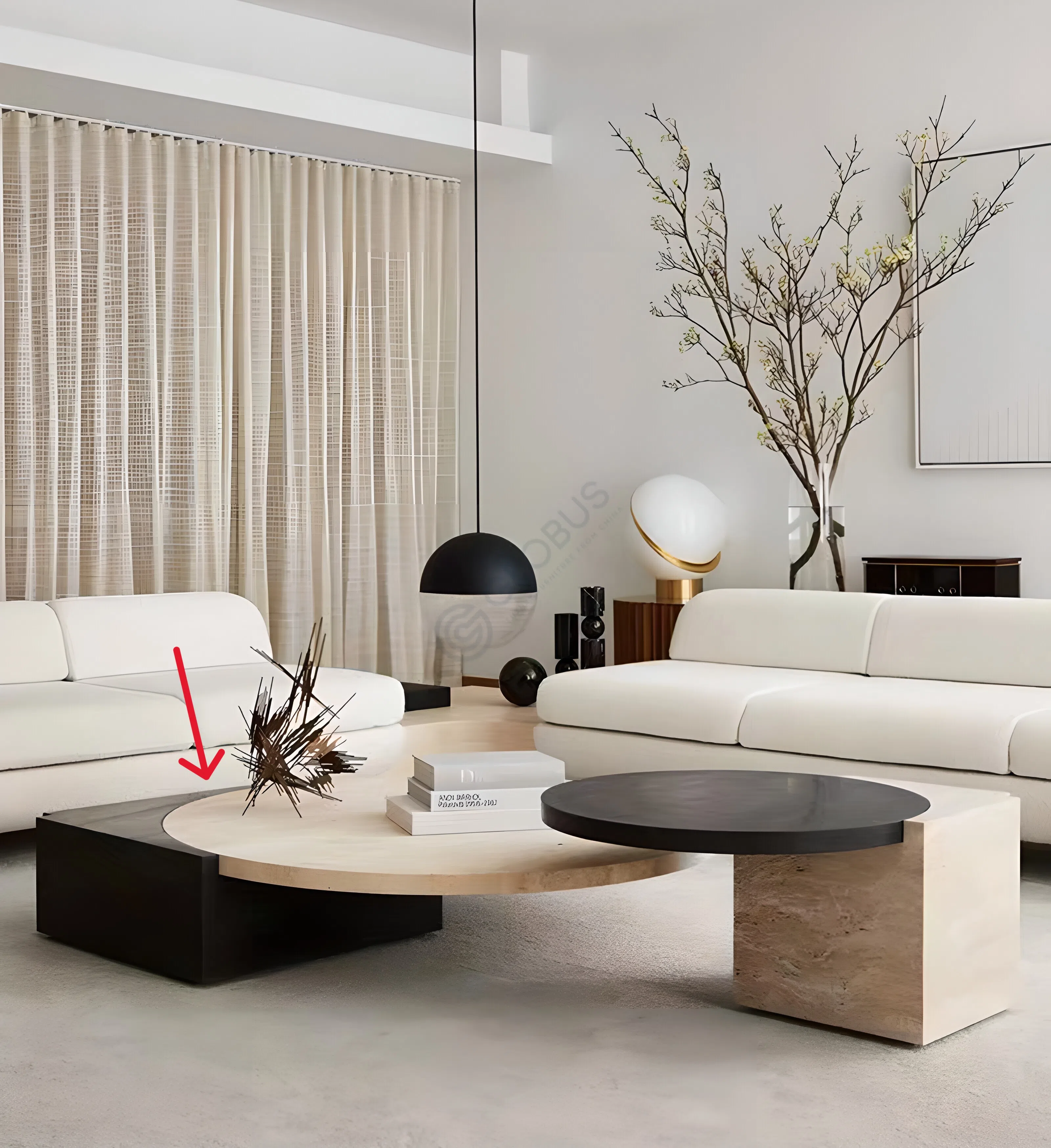 На вершине травертиновой базы покоится круглая столешница из натурального мрамора глубокого темного оттенка. Гладкая, прохладная поверхность мрамора создает выразительный контраст с матовой фактурой травертина, подчеркивая геометрическую чистоту и гармонию форм.