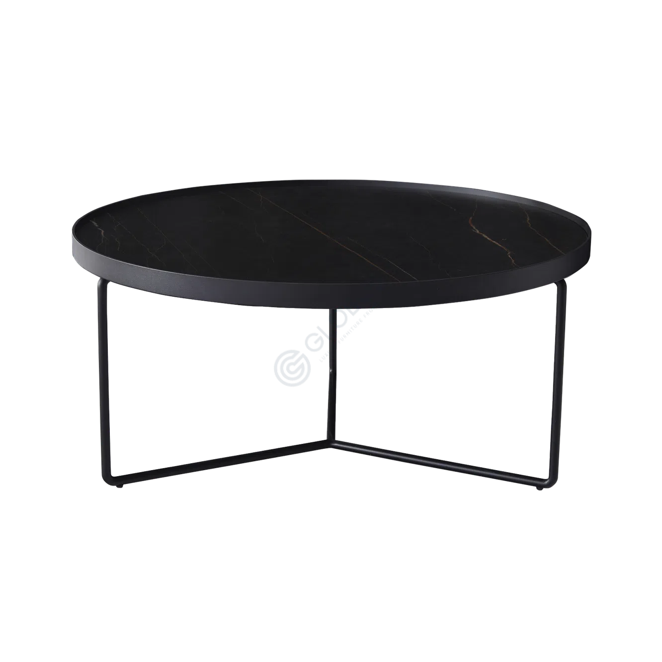 Изделие отличает столешница из натурального мрамора. Уникальный рисунок камня придает поверхности особую глубину и роскошь, подчеркивая премиальное качество. Окантовка и тонкое основание выполнены из нержавеющей стали, добавляя конструкции легкости и прочности.