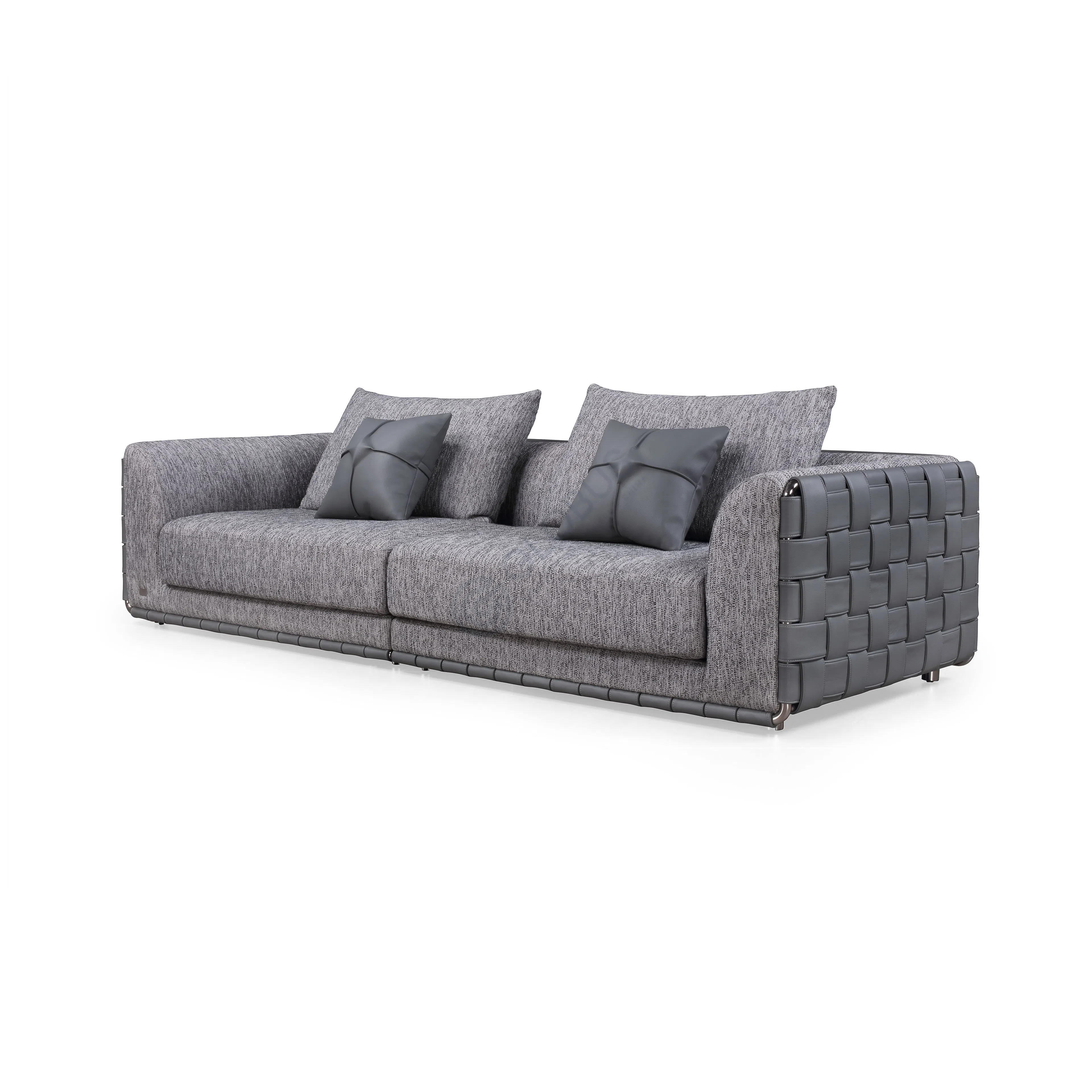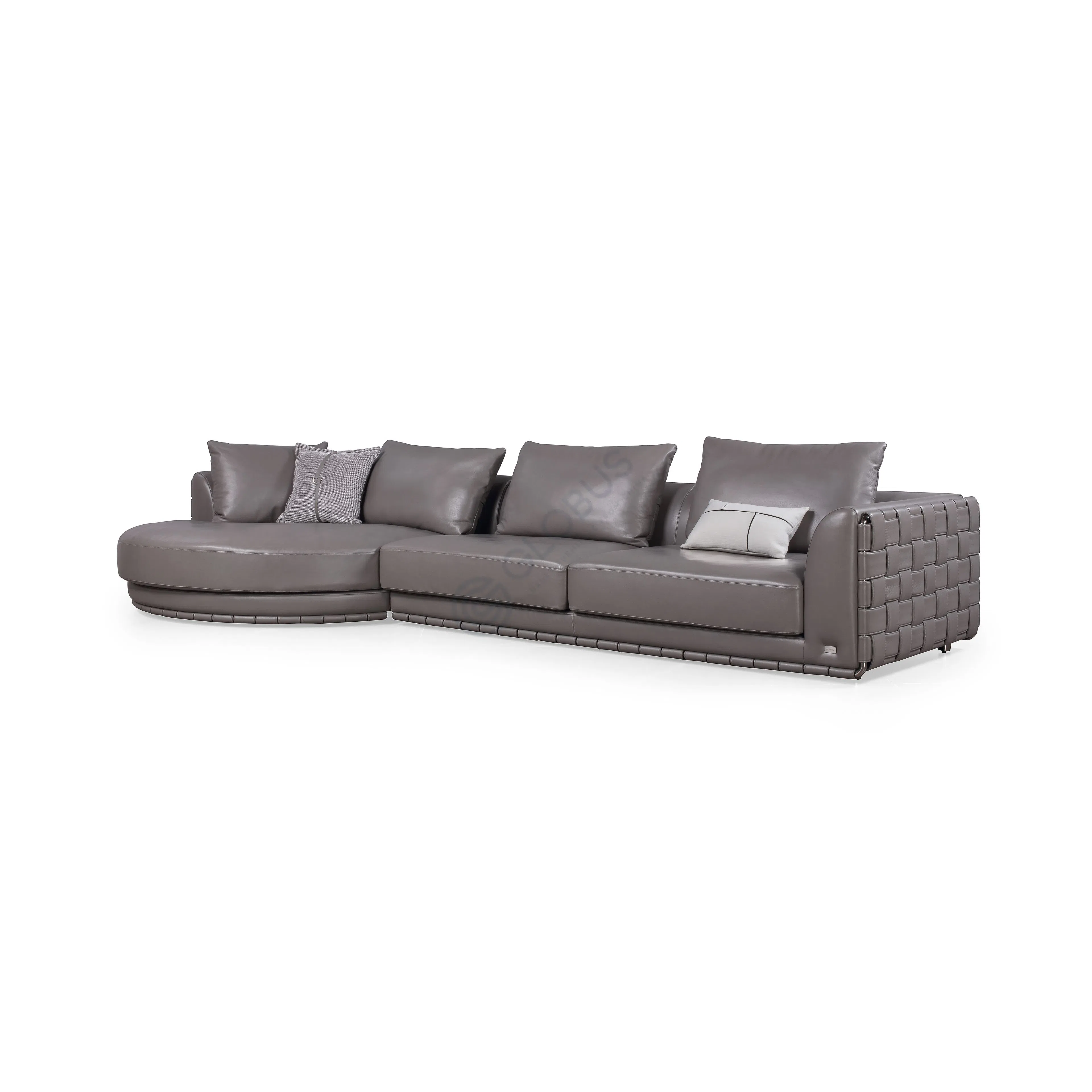 Особое внимание привлекает выразительное основание. Нижняя часть корпуса украшена декоративным элементом с объемной текстурой, напоминающей крупное плетение. Уютное изголовье обладает плавной конфигурацией, предлагая комфортную опору.