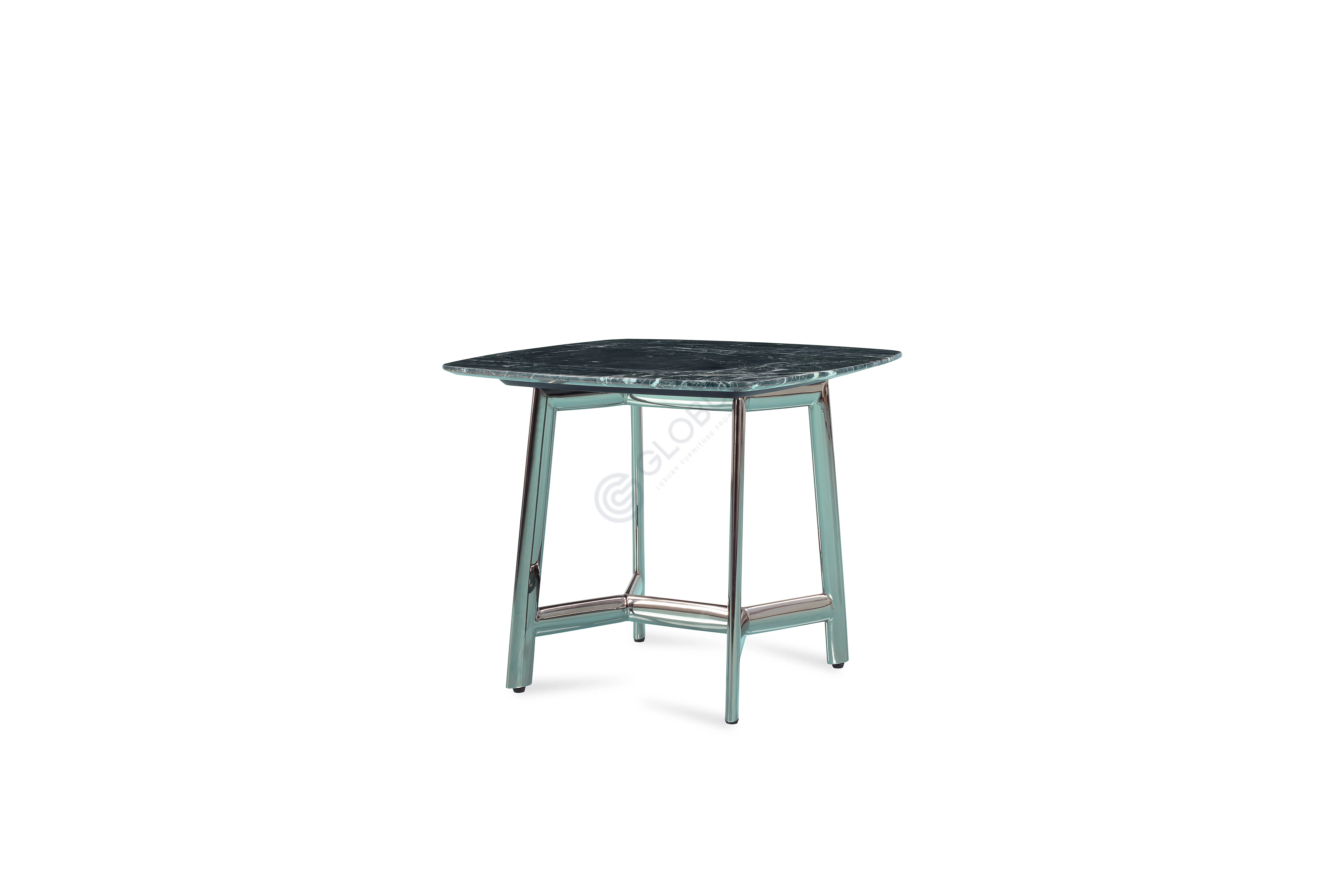 Основание стола изготовлено из полированной нержавеющей стали. Металлические опоры обладают прочностью и устойчивостью, формируя надежную конструкцию. Блестящая поверхность стали эффектно контрастирует с природной красотой камня, подчеркивая современную эстетику дизайна.