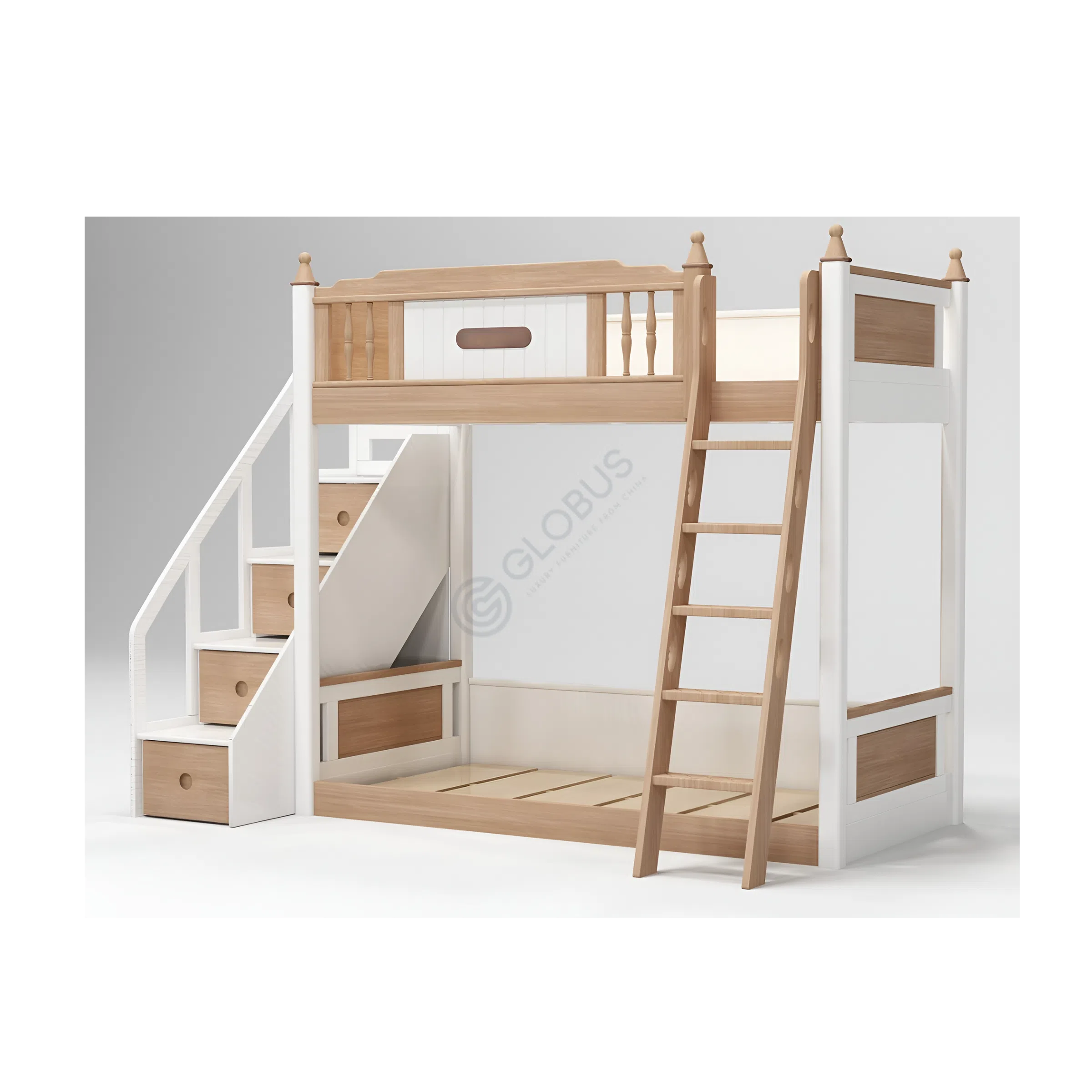 Основа конструкции — натуральное дерево, материал, ценящийся за свою прочность, долговечность и экологичность. Природная текстура древесины в теплом оттенке красиво контрастирует с чистым белым цветом отделки, создавая светлый и уютный образ, который идеально вписывается в интерьер любой детской комнаты.