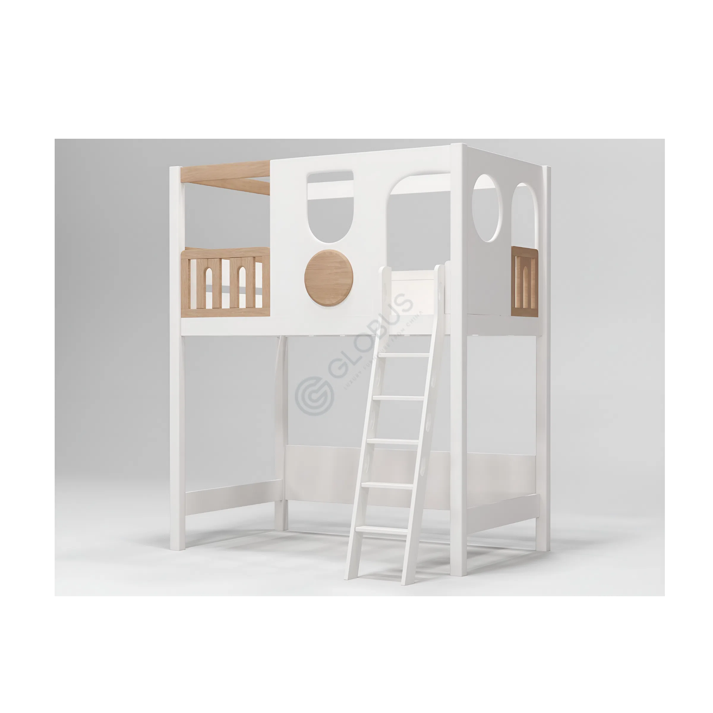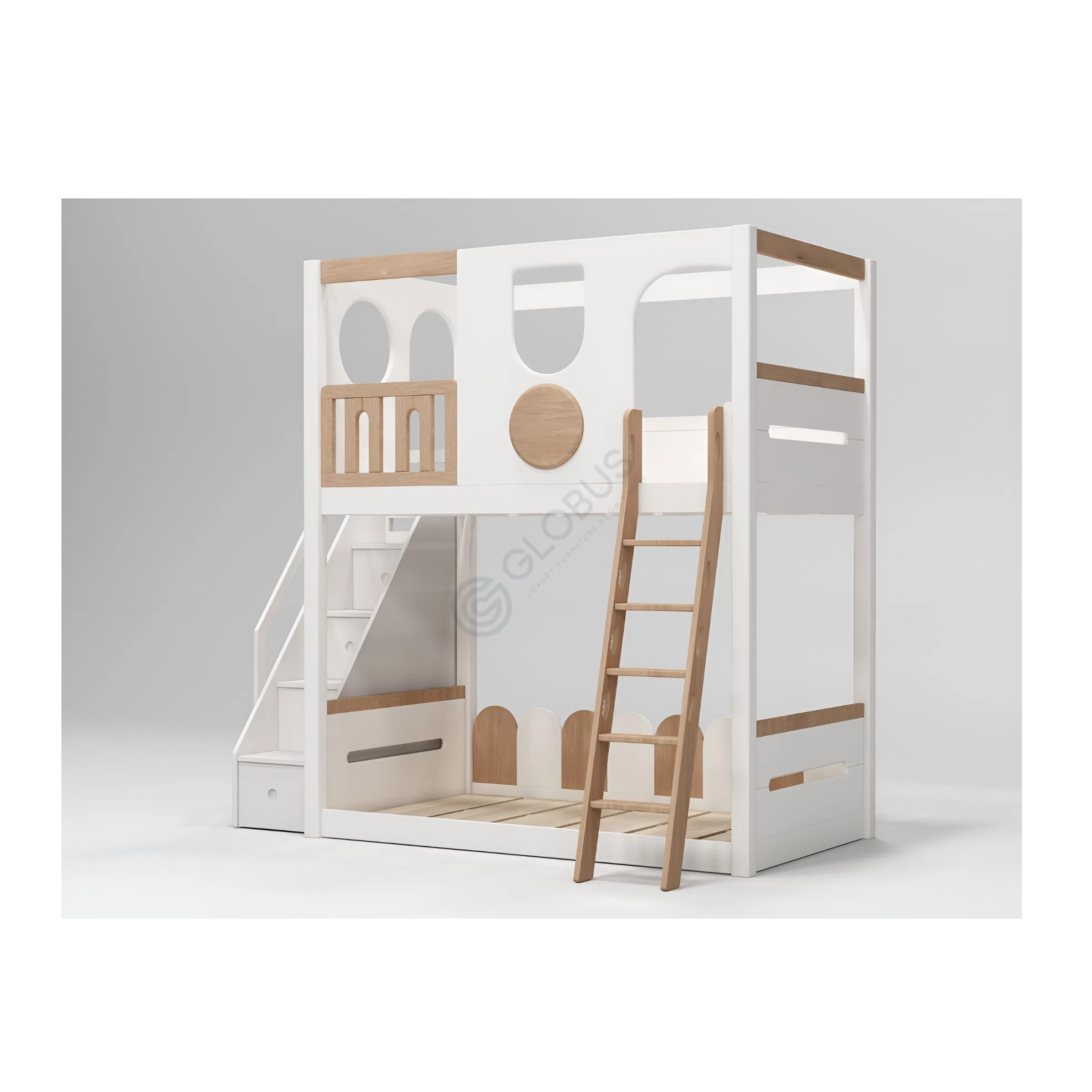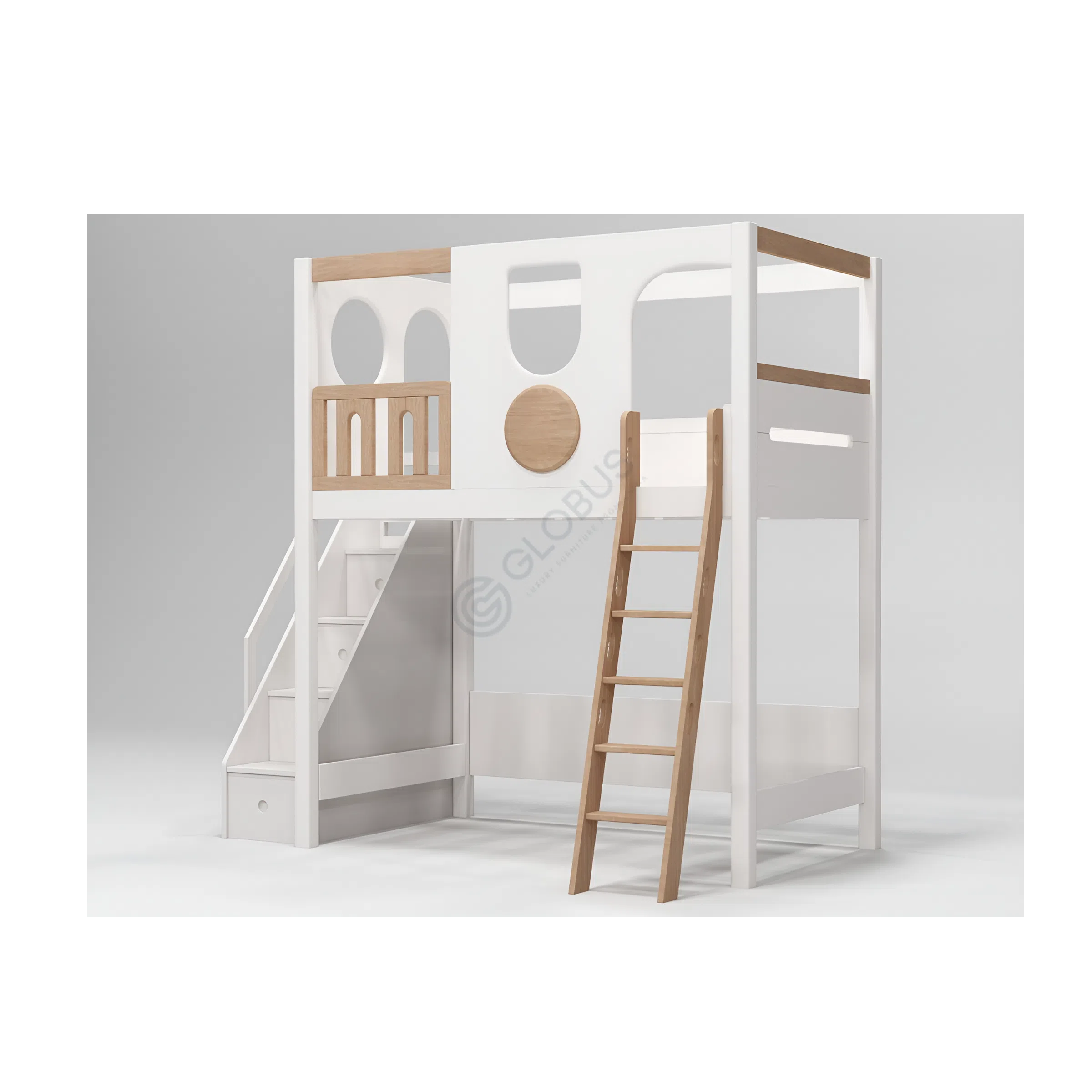 Продуманная лестница обеспечивает удобный и безопасный доступ к верхнему уровню, скрывая внутри полезное пространство для хранения. Каждый шаг лестницы может служить ящиком или полкой, помогая поддерживать порядок. На верхнем ярусе располагается спальное место, окруженное надежным ограждением, обеспечивающим спокойный сон. Элементы дизайна, напоминающие окна и уютный балкончик с деревянными перилами, добавляют игривости, создавая ощущение личного домика или крепости.