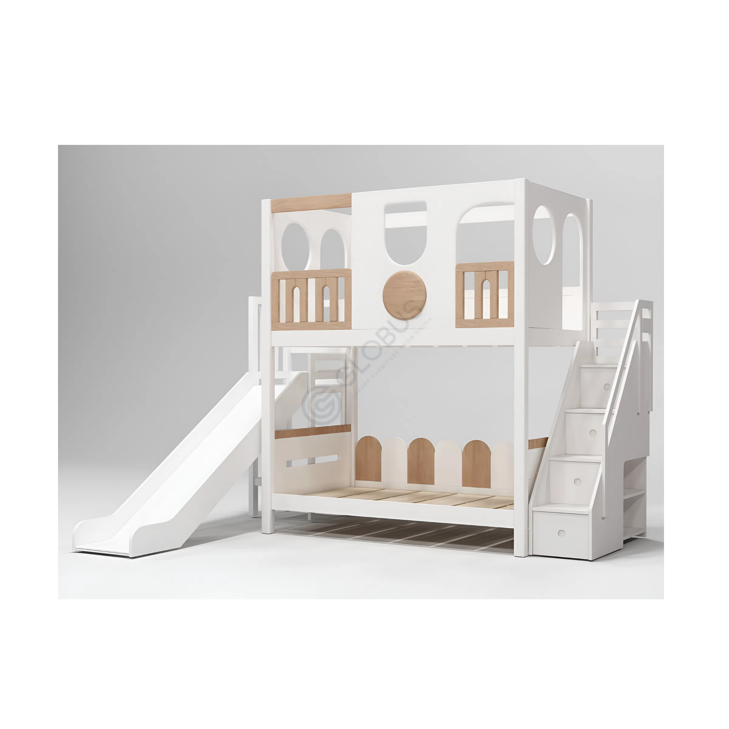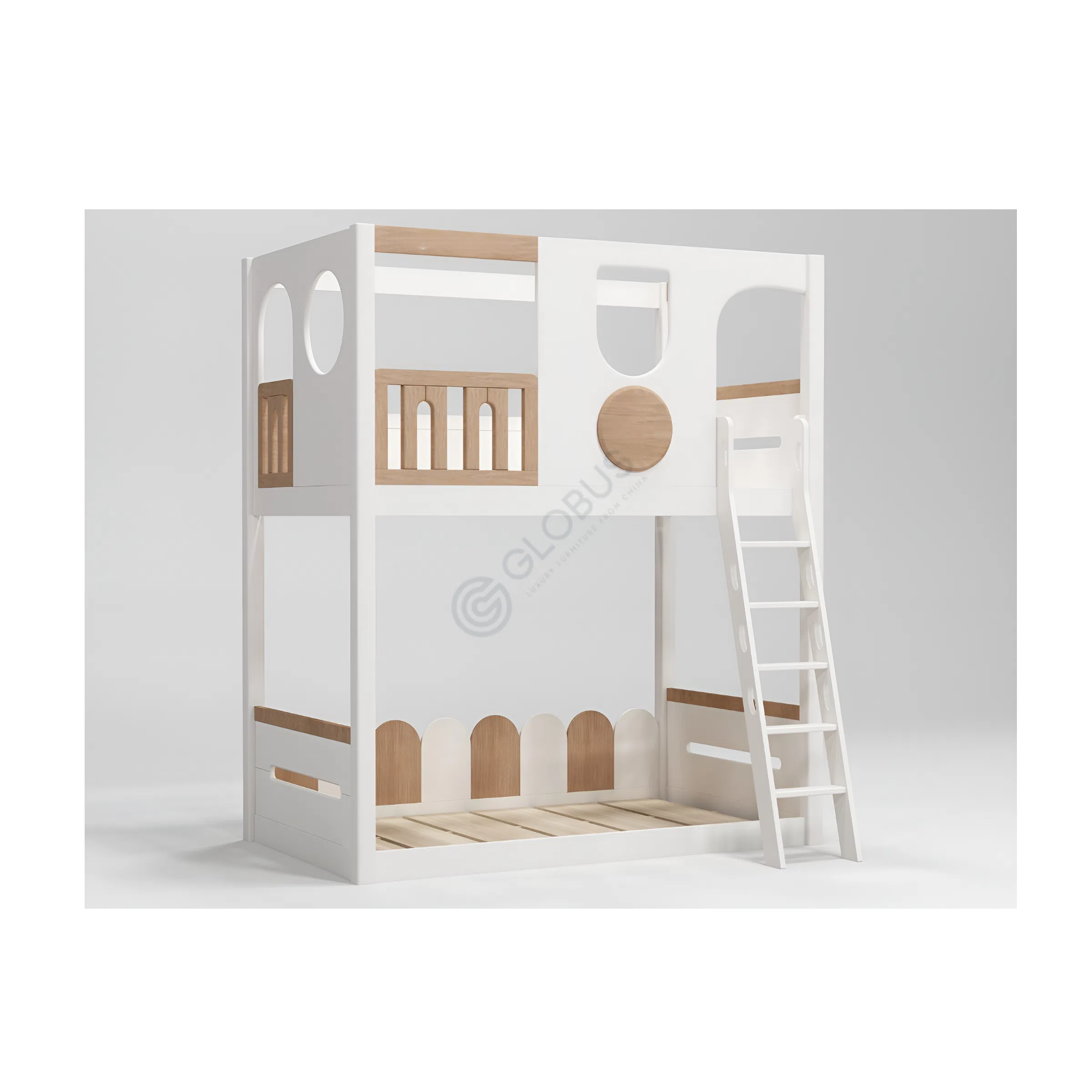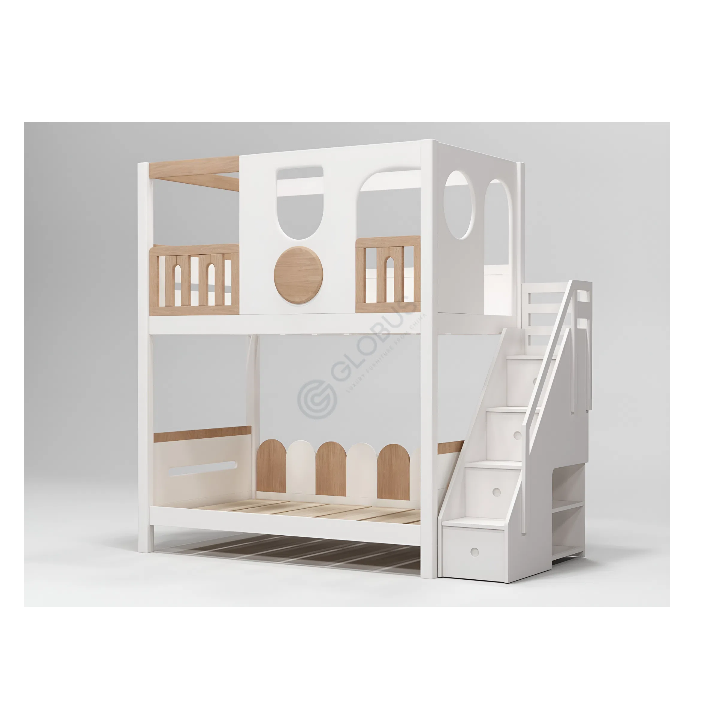 Продуманная лестница обеспечивает удобный и безопасный доступ к верхнему уровню, скрывая внутри полезное пространство для хранения. Каждый шаг лестницы может служить ящиком или полкой, помогая поддерживать порядок. На верхнем ярусе располагается спальное место, окруженное надежным ограждением, обеспечивающим спокойный сон. Элементы дизайна, напоминающие окна и уютный балкончик с деревянными перилами, добавляют игривости, создавая ощущение личного домика или крепости.
