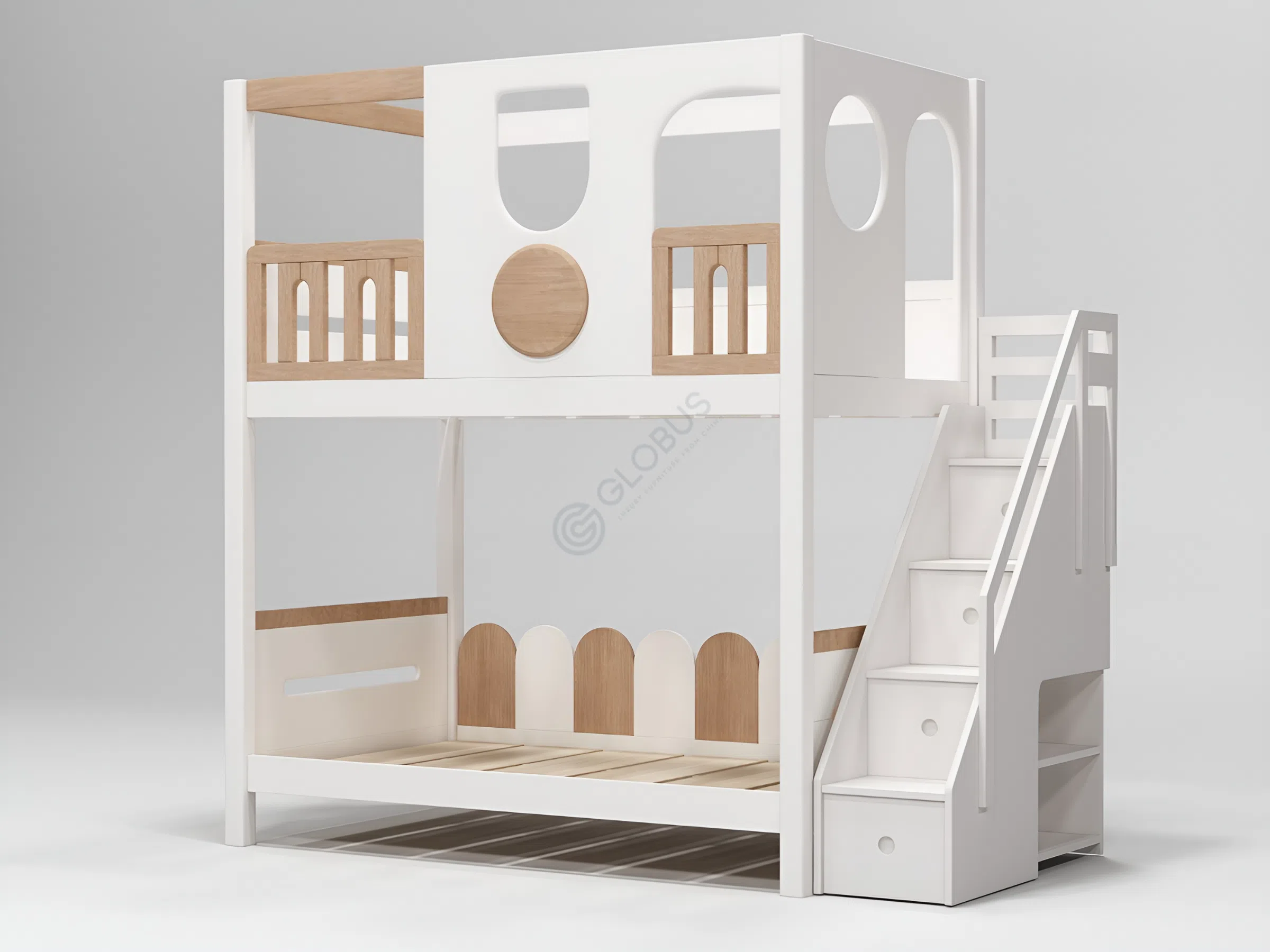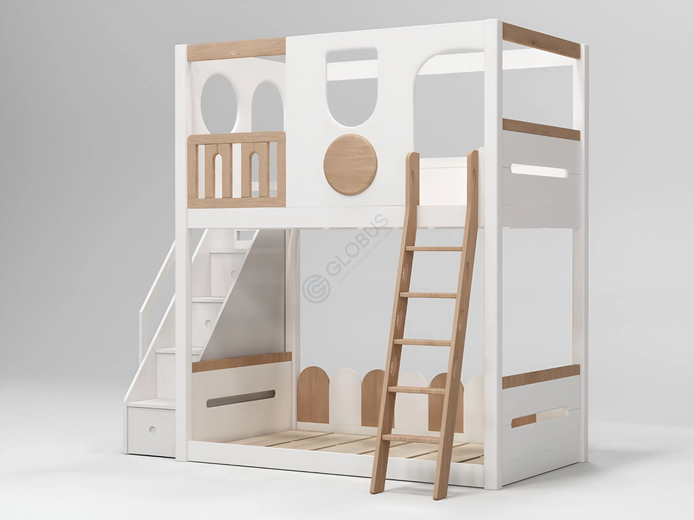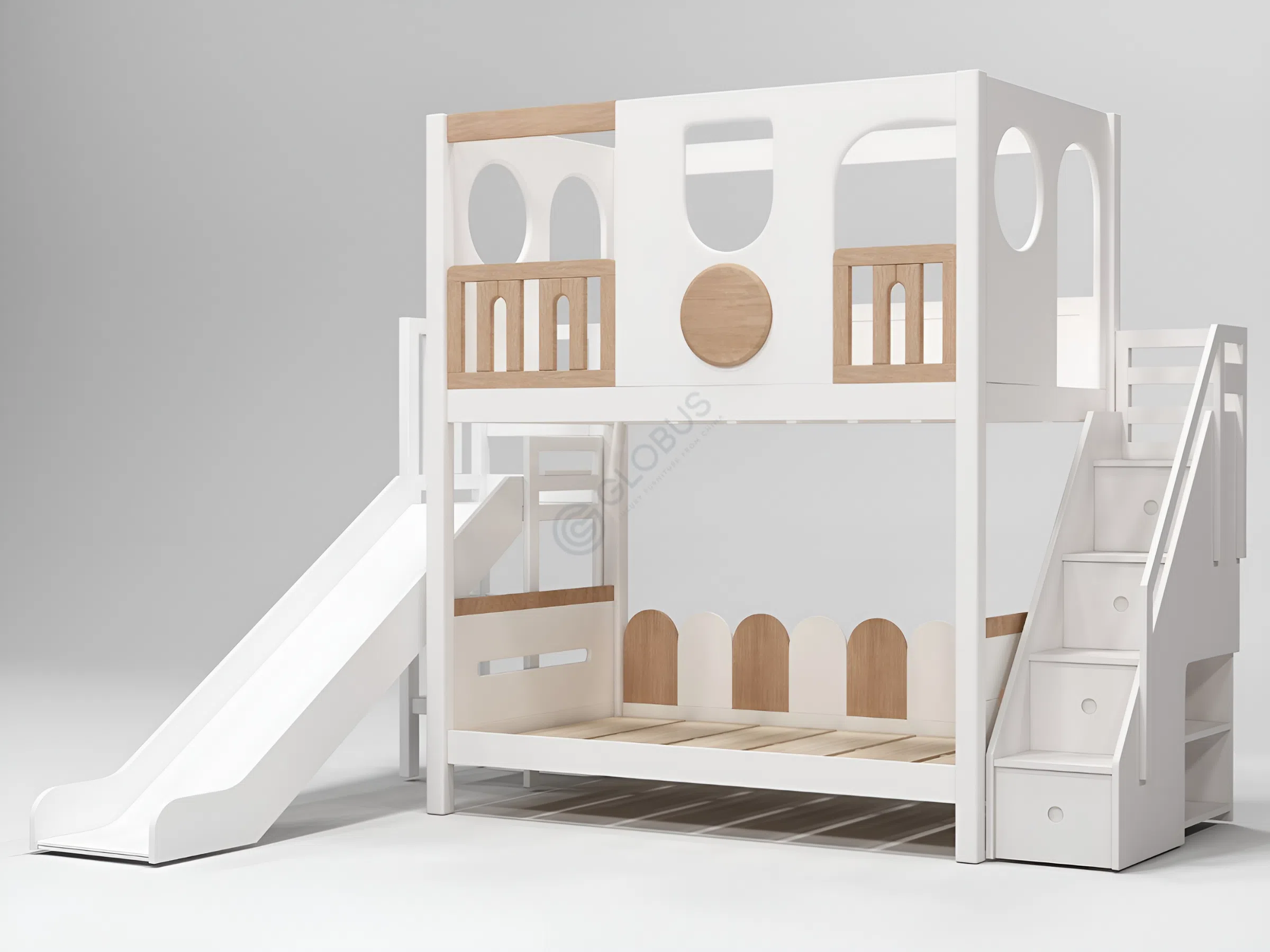 Дизайн кровати выполнен в современном стиле, напоминающем уютный домик или крепость на высоте. Оригинальные окошки и открытые проемы стимулируют воображение ребенка, превращая обычную кровать в захватывающую игровую зону. Интегрированная горка добавляет элемент веселья, предлагая увлекательный способ начать утро.