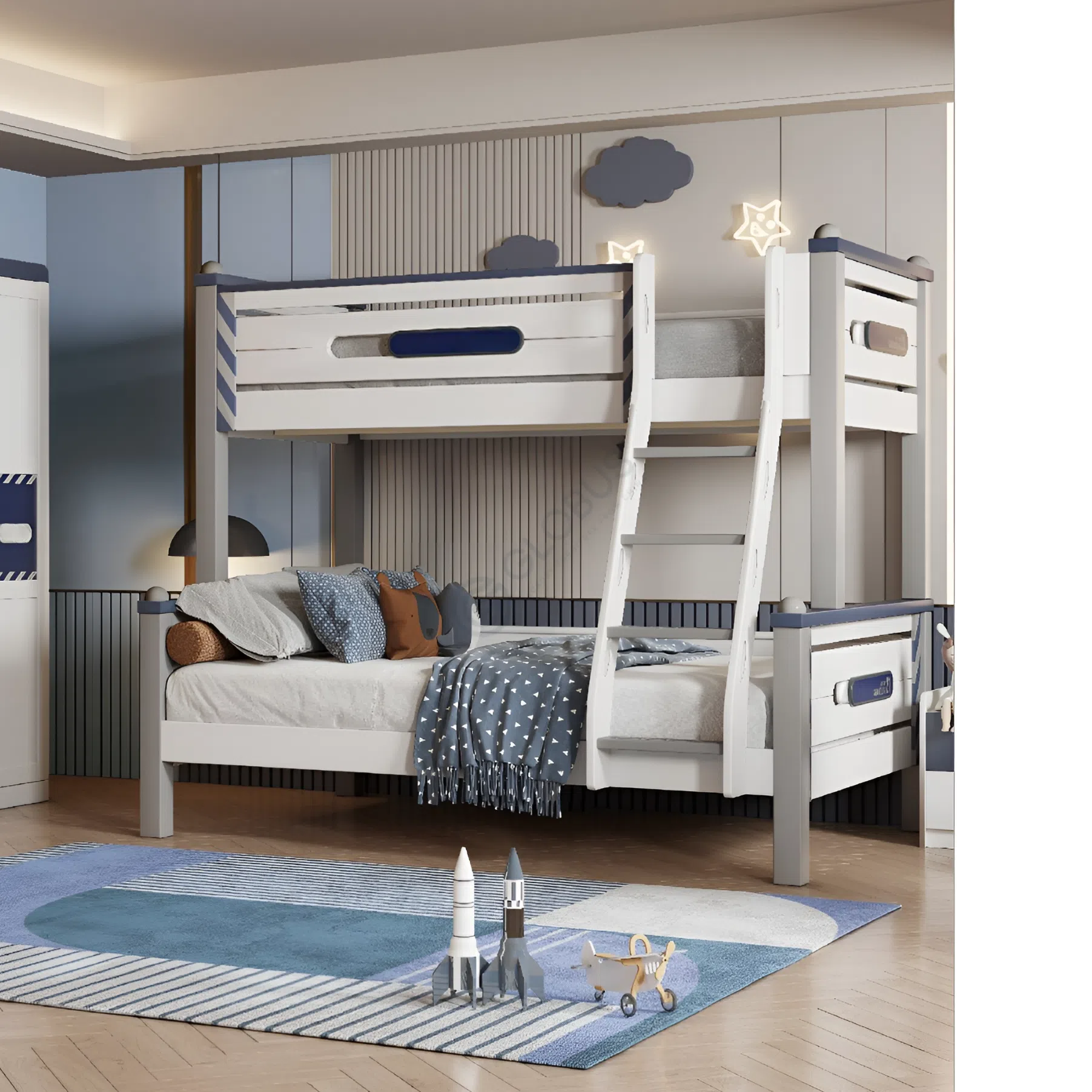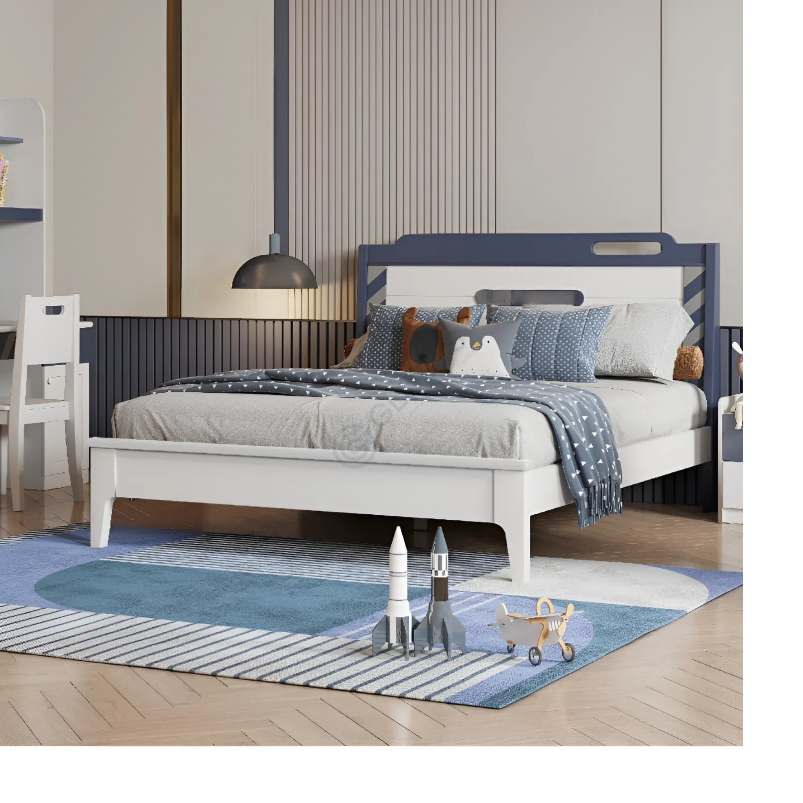 Выполненный в современном ключе, этот предмет мебели гармонично сочетает в себе минималистичные формы и продуманную функциональность. Чистые линии и спокойная цветовая палитра с акцентами на оттенках синего и белого создают располагающую к занятиям атмосферу. Основой служит натуральное дерево, чей природный материал привносит в интерьер тепло и уют, одновременно гарантируя долговечность конструкции.
