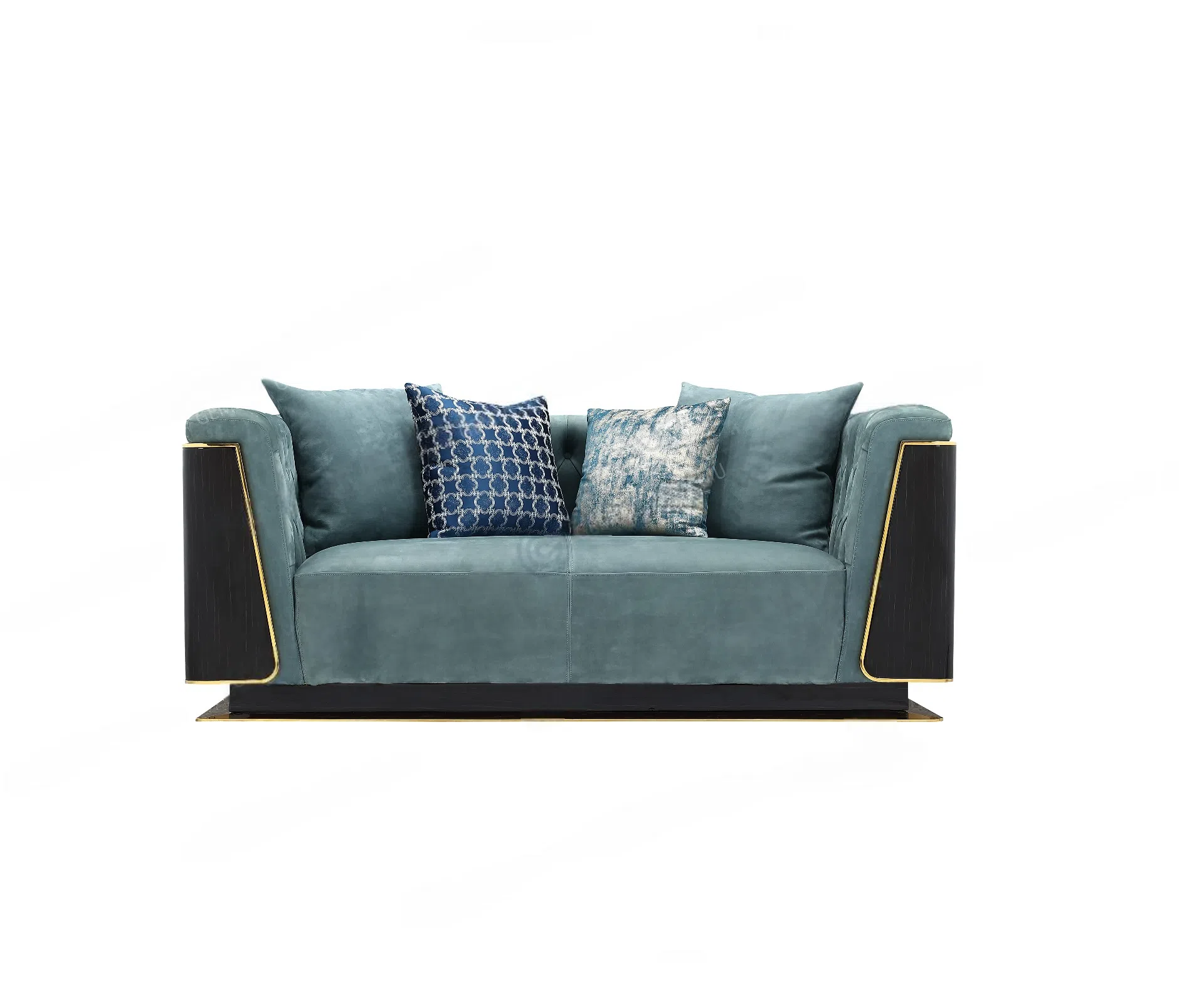Силуэт этого изделия отличают четкие линии и структурированные подлокотники, подчеркнутые контрастными панелями из шпона. Золотистый металлический профиль изящно обрамляет эти элементы, добавляя изысканного блеска. Пышное сиденье и спинка, обтянутые приятной на ощупь экокожей на микрофибре, приглашают к отдыху.