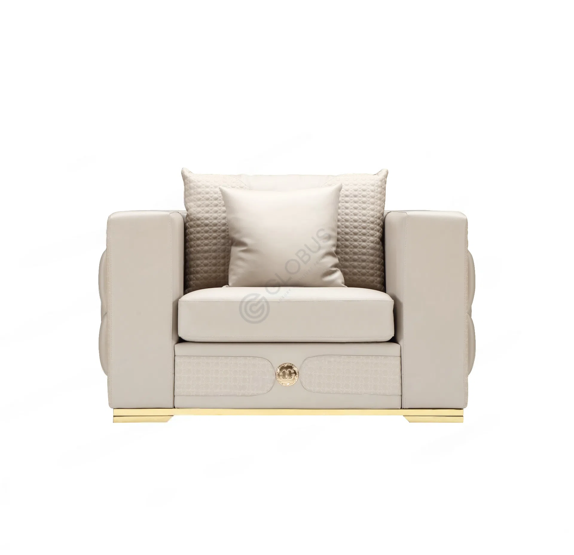 Актуальная эстетика проявляется в его чистых линиях и гармоничных пропорциях. Декоративные акценты, такие как изящное металлическое основание и текстурные детали на боковинах и царге, придают изделию уникальность. Мягкие подушки дополняют образ, предлагая дополнительную поддержку и приглашая к расслаблению.