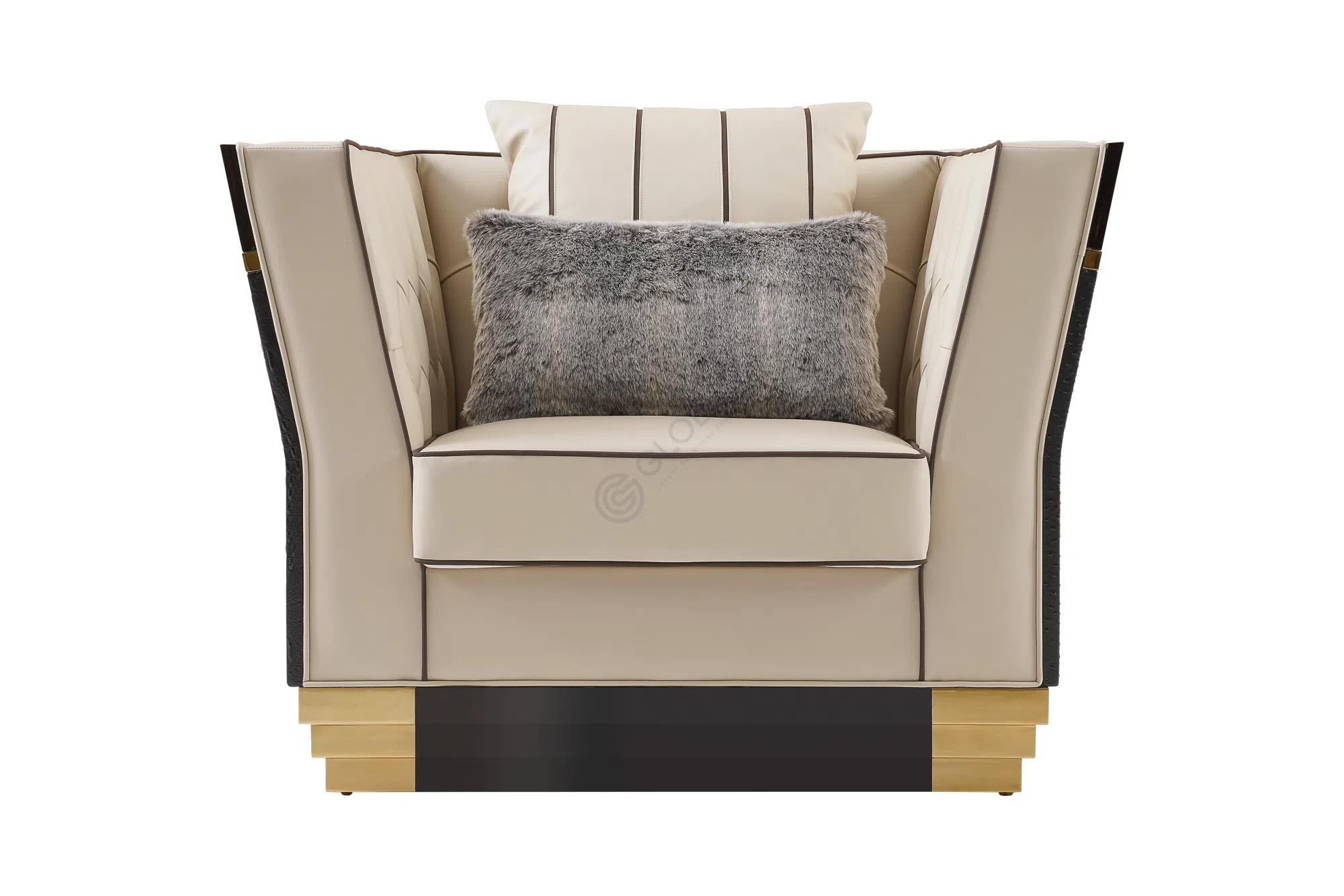 Внимание привлекает проработка деталей: элегантная стежка на спинке, четкие линии подлокотников с геометрическим узором шпона и металлическими элементами. Контрастная окантовка подчеркивает формы, а основание с золотистыми акцентами придает предмету устойчивость и завершенность образа.