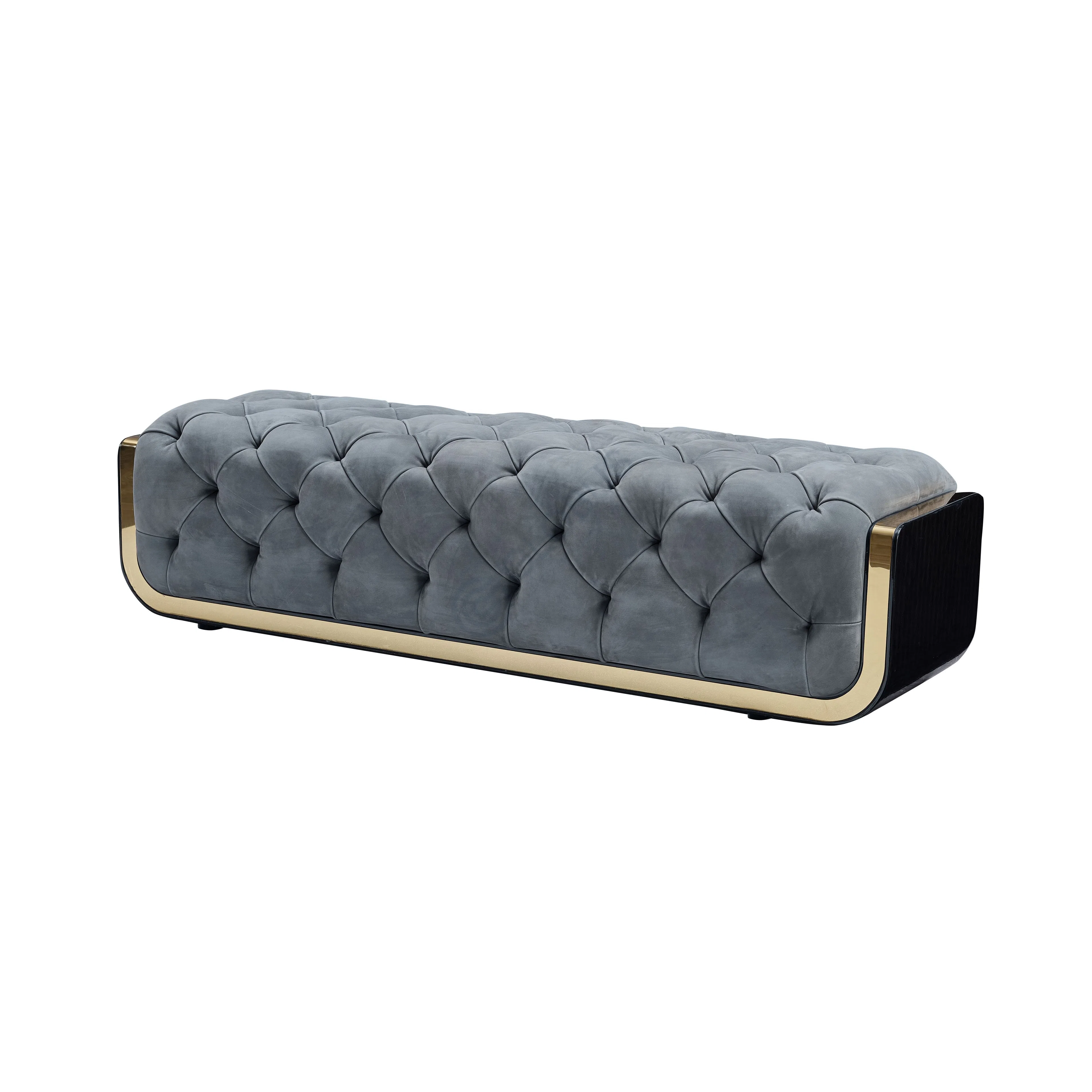 Особое внимание привлекает высокое изголовье с глубокой утяжкой, выполненное из нежной замши или высококачественной экокожи на микрофибре. Его геометрический рисунок придает объем и изысканность, а изящные металлические вставки по бокам подчеркивают четкость линий и добавляют нотку современного шика.