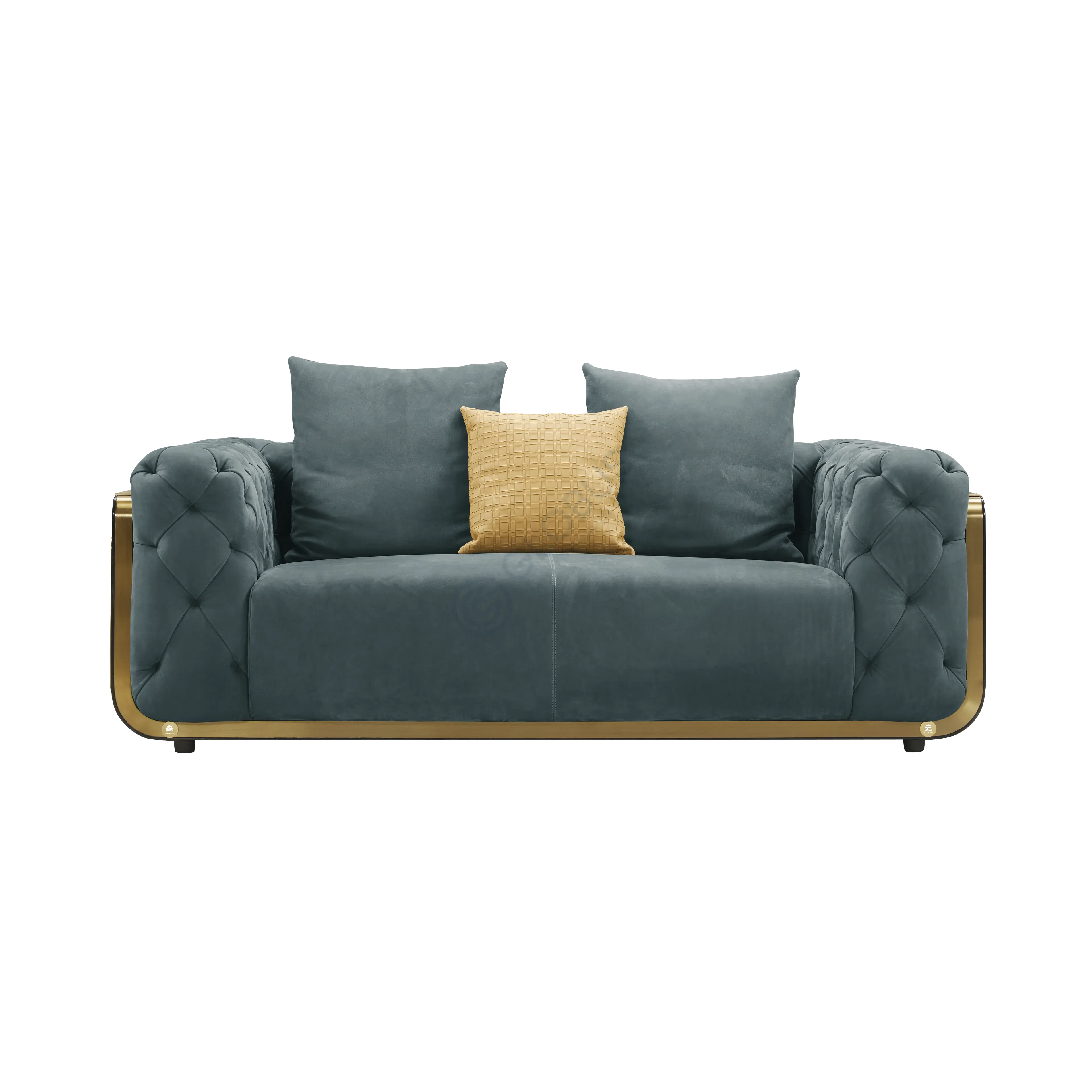 Основа предмета выполнена из натурального дерева, обеспечивая прочность и долговечность конструкции. Изящные акцентные элементы из металла с блестящим золотистым покрытием гармонично обрамляют боковые части, добавляя нотку гламура и визуальной легкости. Искусное сочетание фактур и отделок делает эту банкетку примечательным элементом интерьера.