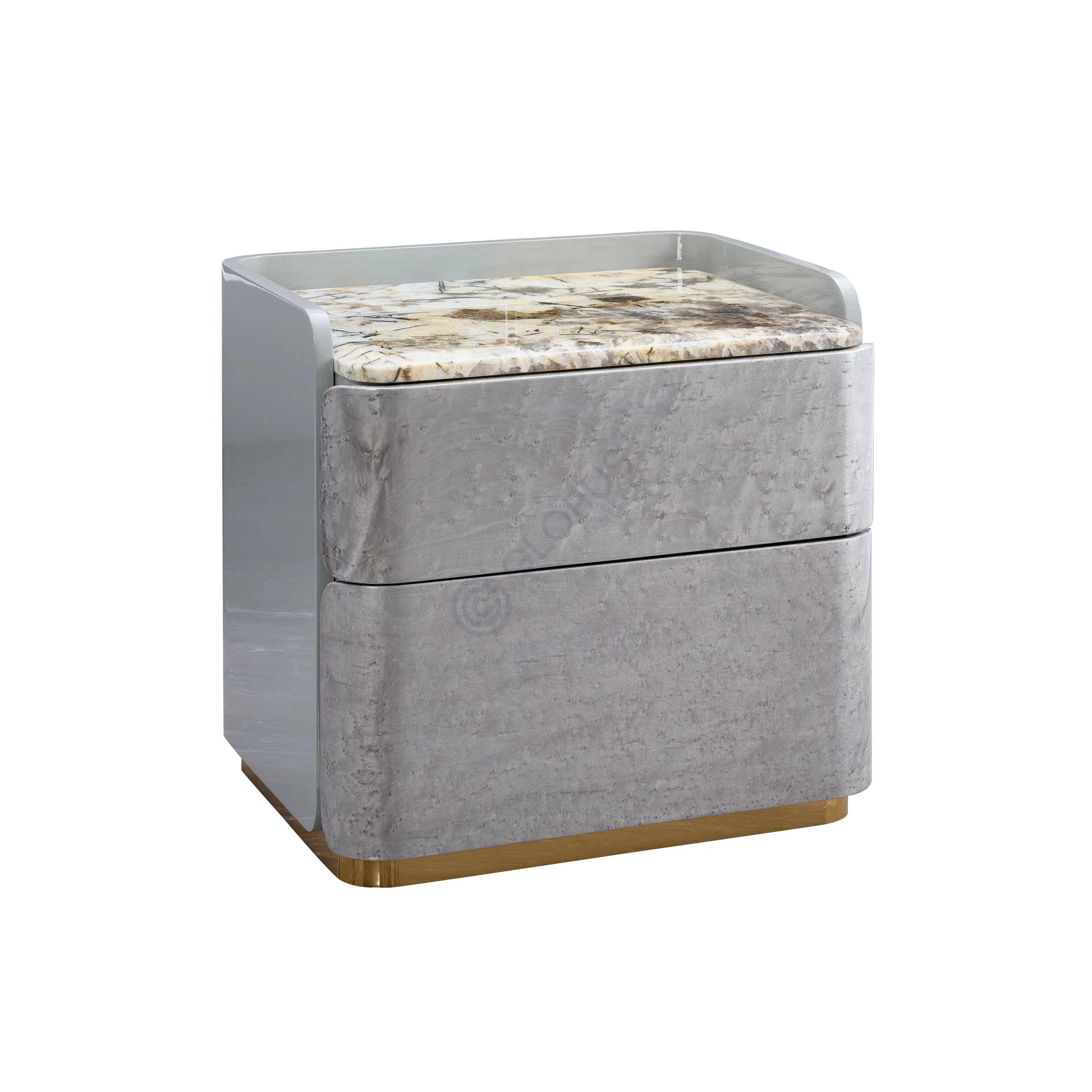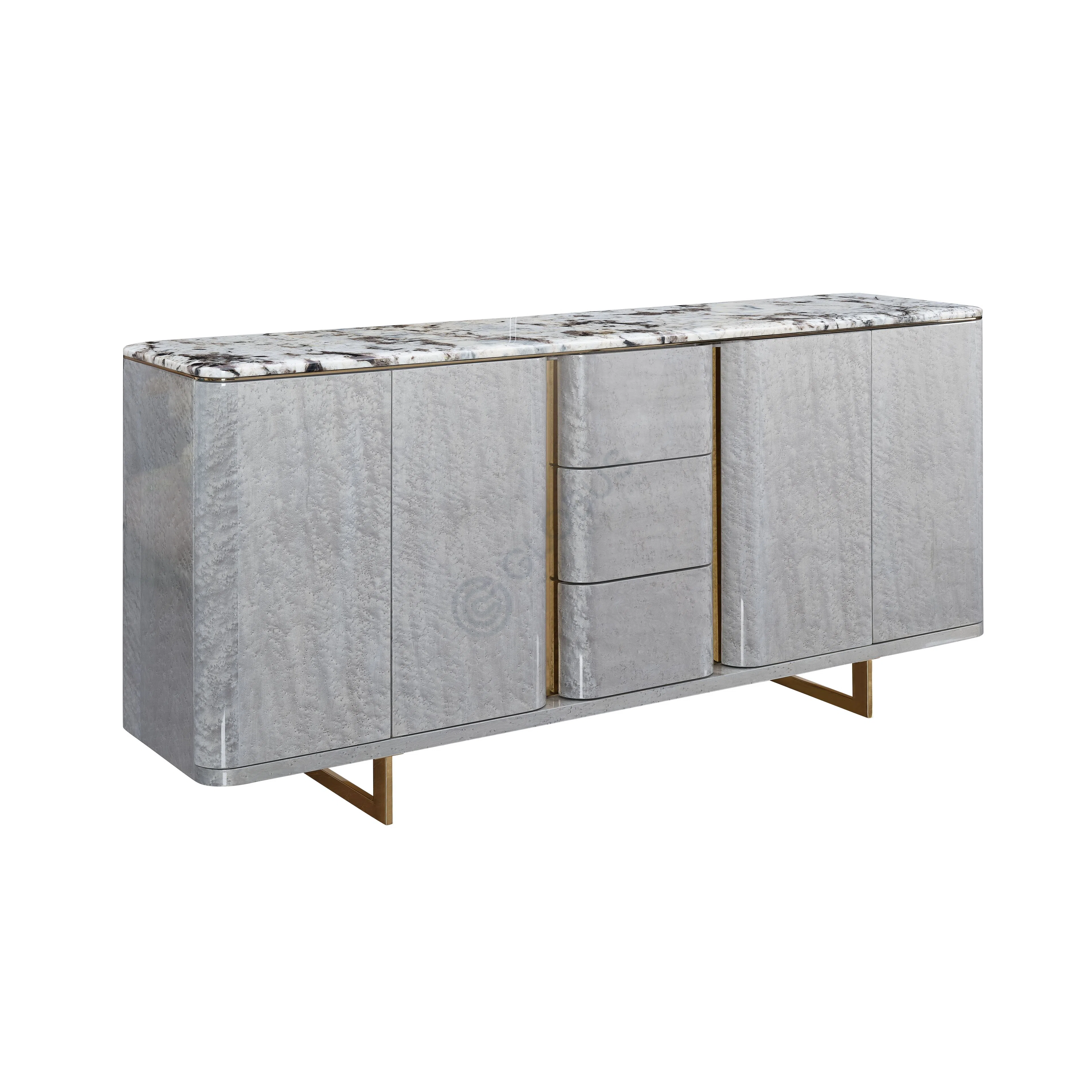 Дизайн фасада включает центральную секцию с двумя удобными выдвижными ящиками, обрамленную по бокам отделениями с распашными дверцами. Скругленные углы смягчают строгую геометрию, добавляя изделию элегантности. Металлические акценты, служащие основанием, придают конструкции визуальную невесомость и современный вид, завершая образ этого предмета мебели премиум-класса.