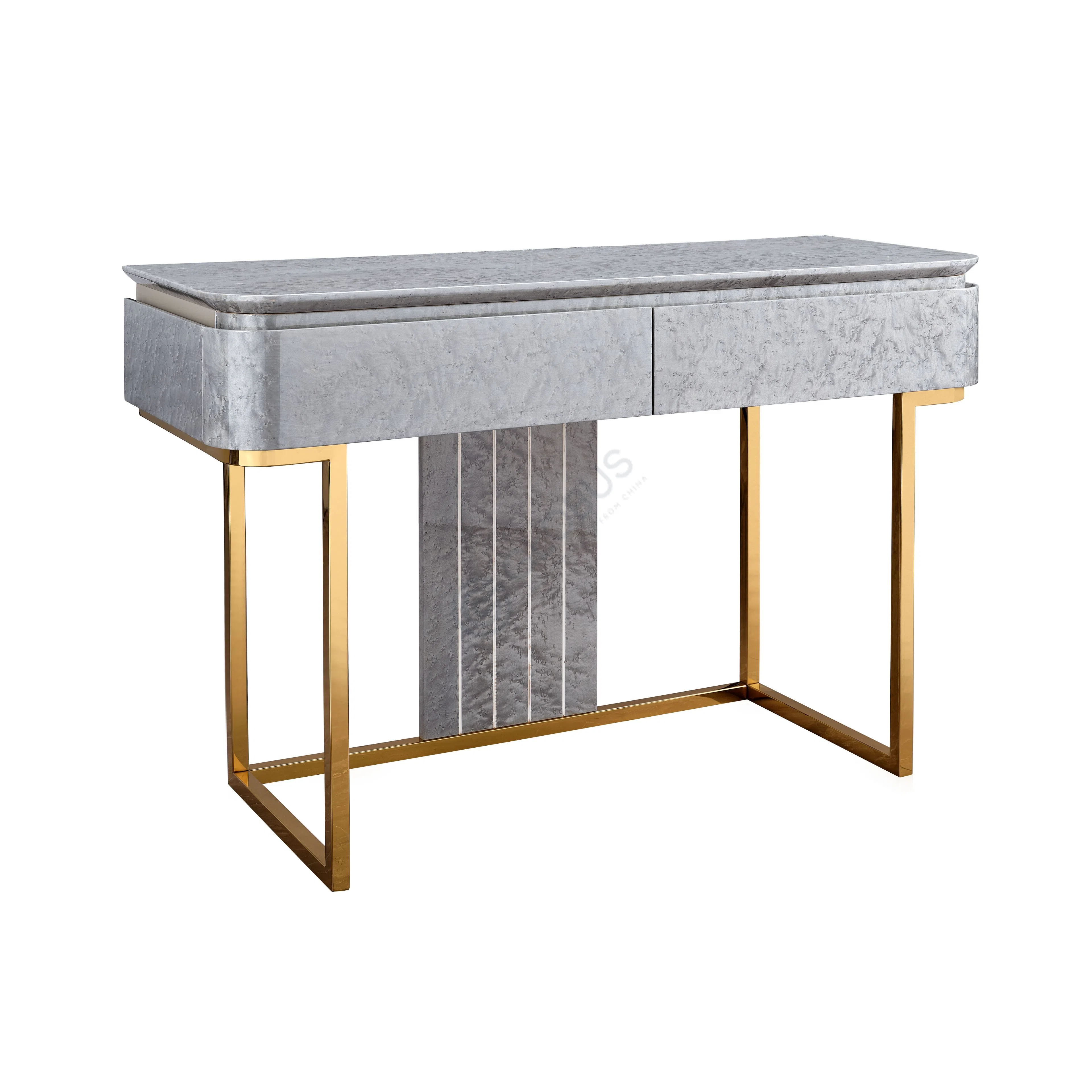 Столешница выполнена из натурального мрамора, чей уникальный узор придает каждому изделию неповторимый характер. Под мраморной поверхностью располагается корпус, отделанный натуральным шпоном, который подчеркивает теплоту и фактуру древесины. Использование фанеры и натурального дерева в конструкции обеспечивает долговечность и стабильность предмета.