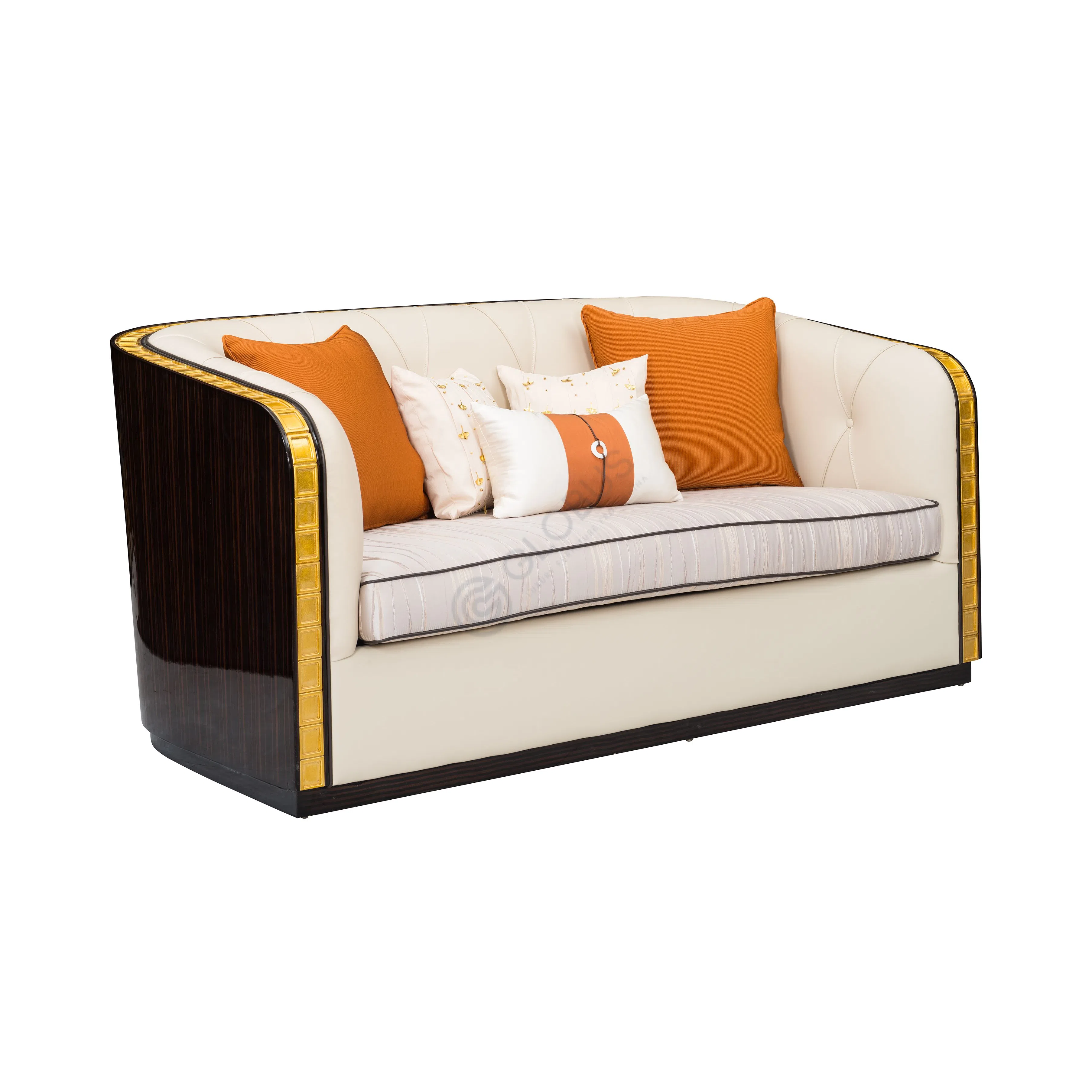 В отделке использованы высококлассные натуральные материалы. Внешняя часть корпуса выполнена из гладкой, глянцевой древесины темного оттенка, демонстрирующей богатство текстуры. Внутренняя обивка выполнена из светлого материала – благородного текстиля или нежной кожи, подчеркнутой элегантной стежкой капитоне на спинке. Декоративный элемент в виде вертикальной золотистой вставки добавляет изделию утонченности и легкого блеска.