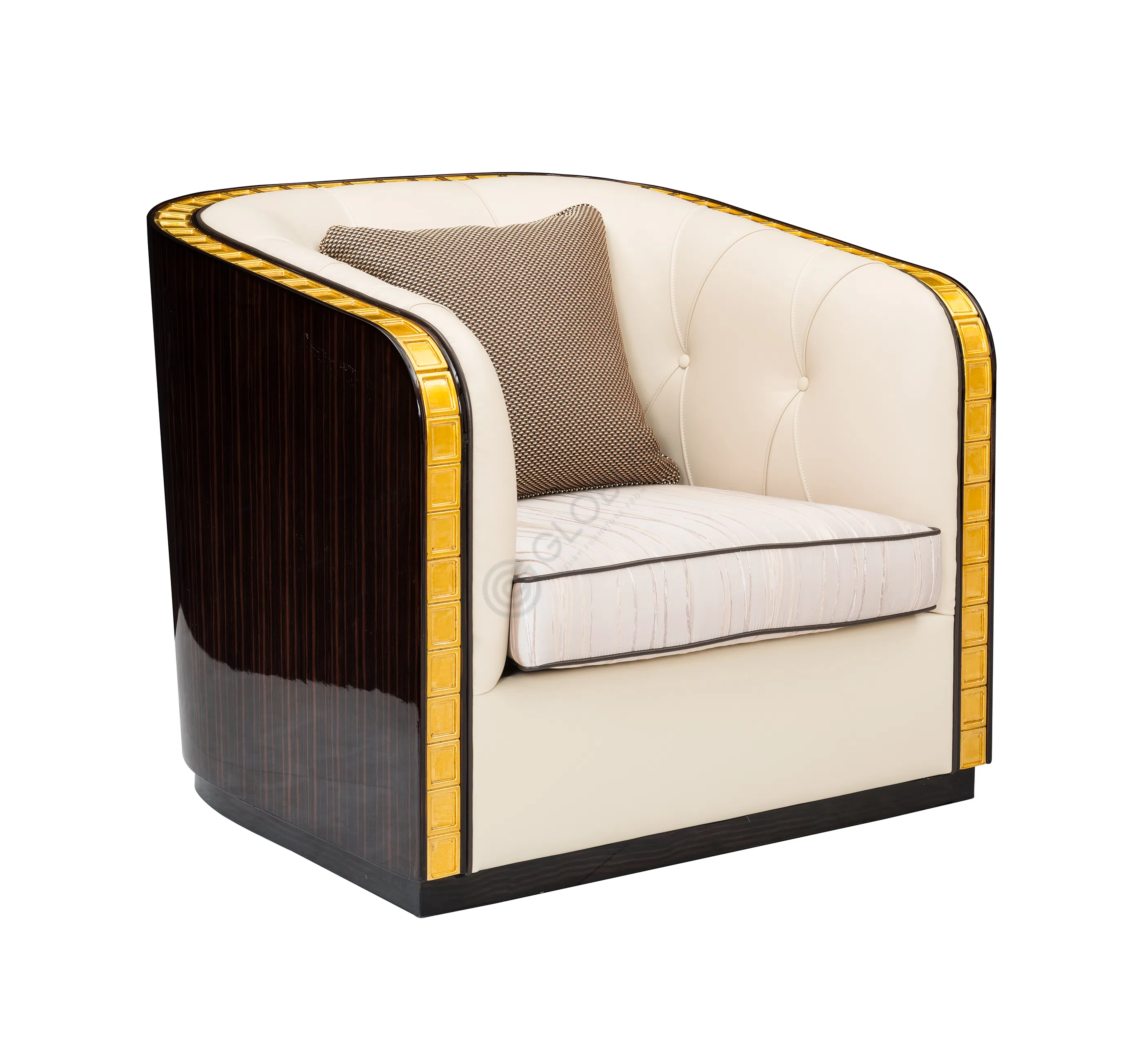 Каркас изделия изготовлен из прочного натурального дерева, обеспечивая надежность конструкции. Внешняя отделка боковых элементов выполнена из темного глянцевого материала, возможно, шпона, который эффектно контрастирует со светлой обивкой. Декоративные золотистые вставки по краю подлокотников добавляют нотку гламура и подчеркивают эксклюзивность дизайна. Основная часть дивана обтянута либо нежной кожей, либо высококачественным текстилем, приятным на ощупь.