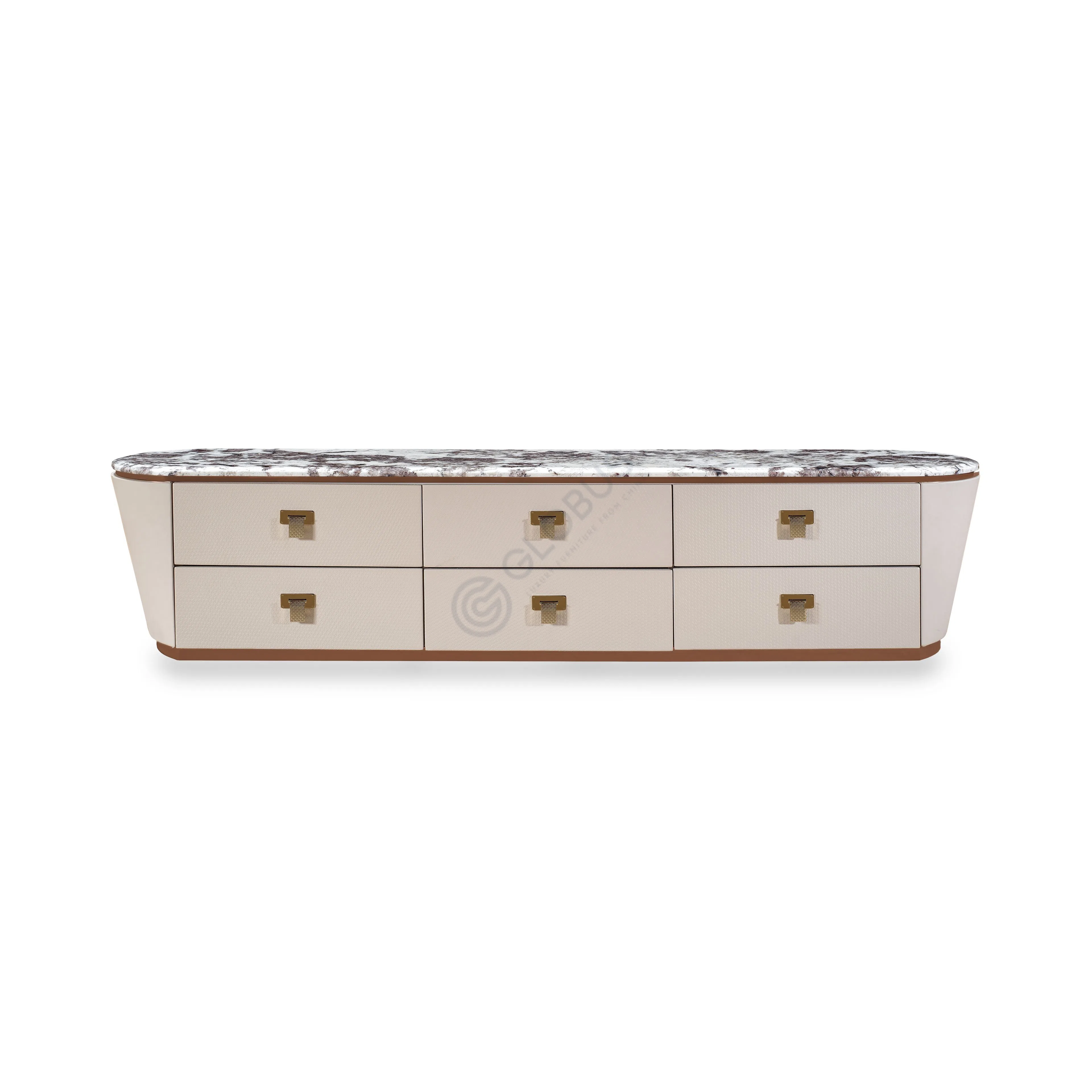 Представляем вам элегантный и функциональный буфет, идеальное сочетание роскоши и современного стиля. Изготовленный из высококачественных натуральных материалов - дерева, мрамора, экокожи на микрофибре и металла, этот буфет прекрасно дополнит вашу гостиную, столовую или кухню.