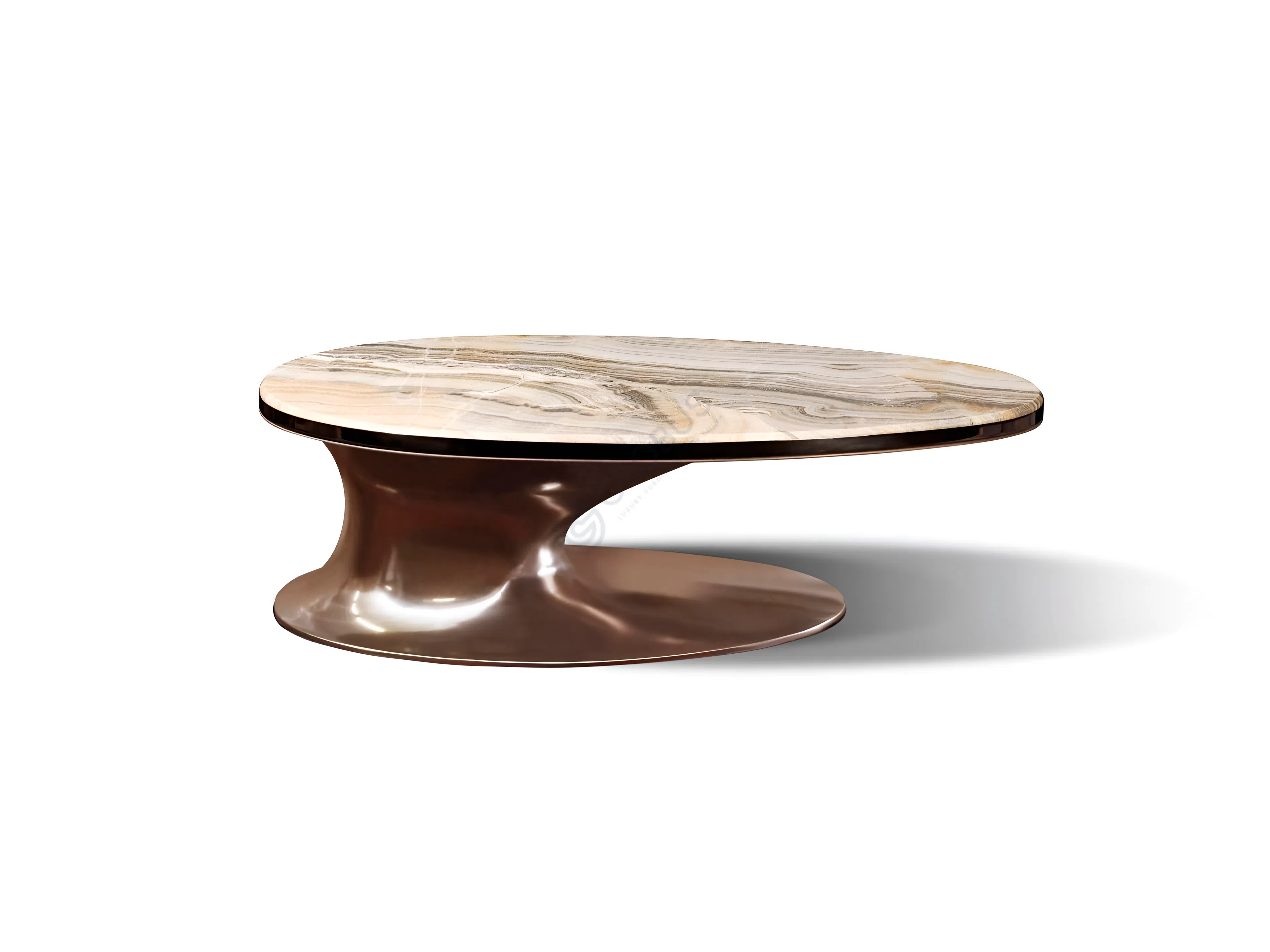 Основание являет собой настоящее произведение искусства. Скульптурная ножка из полированного металла обладает плавной, органичной формой, создающей ощущение движения и легкости. Металлическая поверхность отражает свет, добавляя пространству гостиной сияния и глубины.