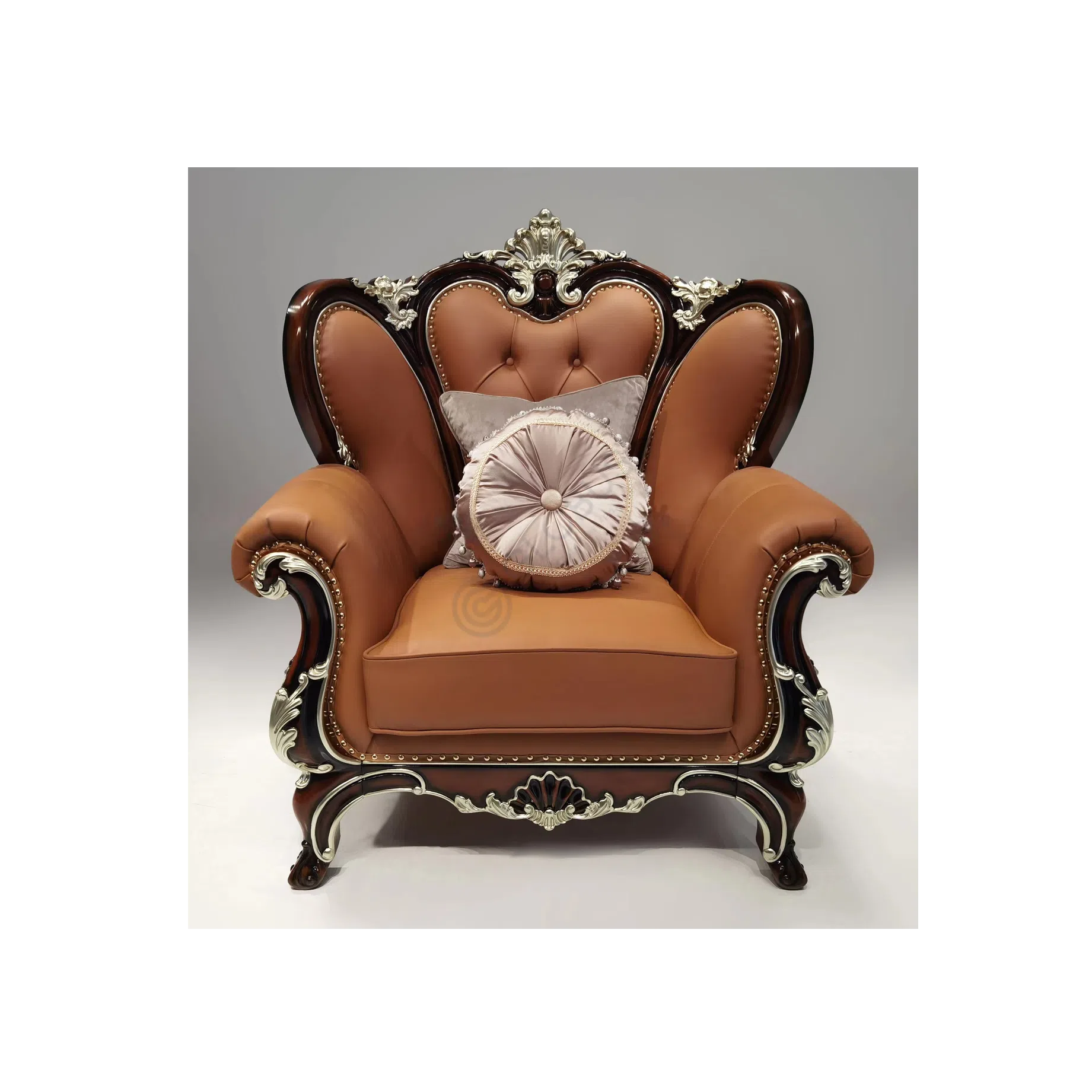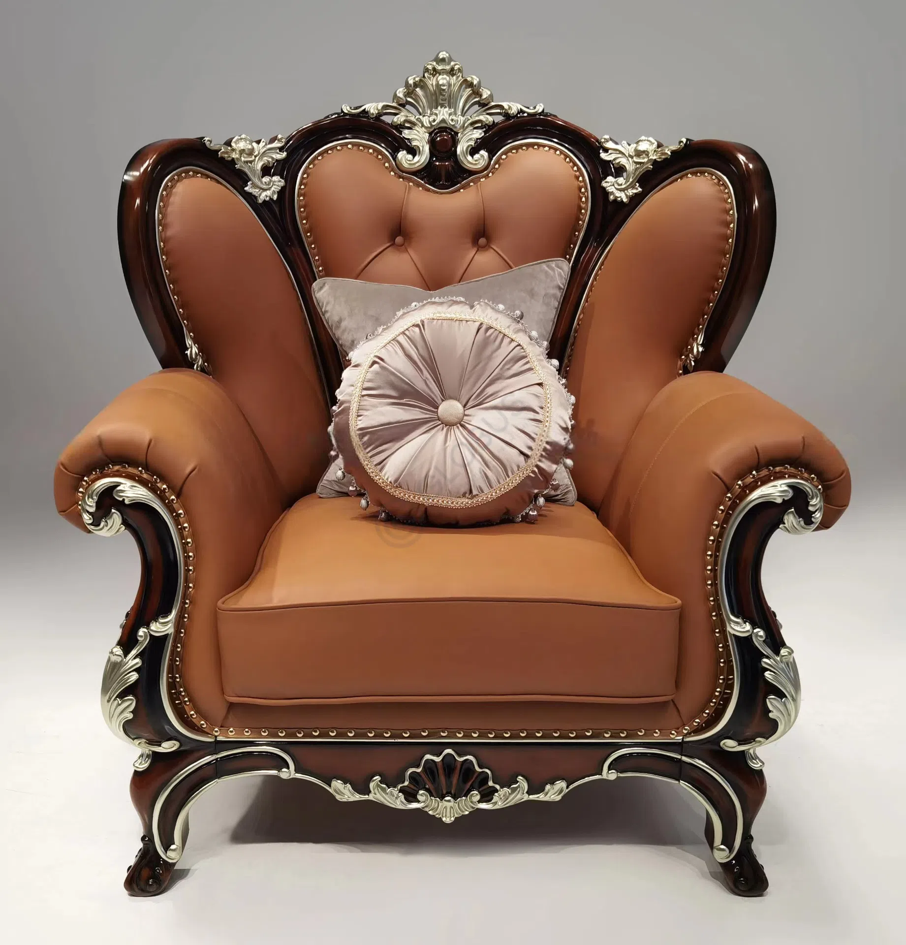Каркас изделия выполнен из отборного натурального дерева, украшенного тонкой ручной резьбой, которая подчеркивает изгибы и линии силуэта. Декоративные элементы, покрытые благородным акцентом, добавляют визуальной роскоши, не перегружая дизайн. Изящные ножки завершают образ, придавая ему утонченность.
