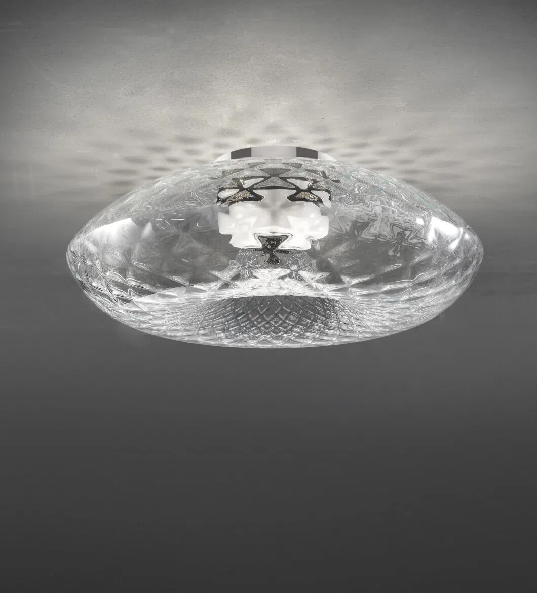 Изящный акцент для современного интерьера, этот настенный светильник приковывает взгляд своим уникальным дизайном. Его форма напоминает драгоценный камень или космическое тело, искусно ограненное для игры света. Прозрачная стеклянная поверхность покрыта сложным геометрическим узором, который создает завораживающие оптические эффекты, преломляя и рассеивая свечение.