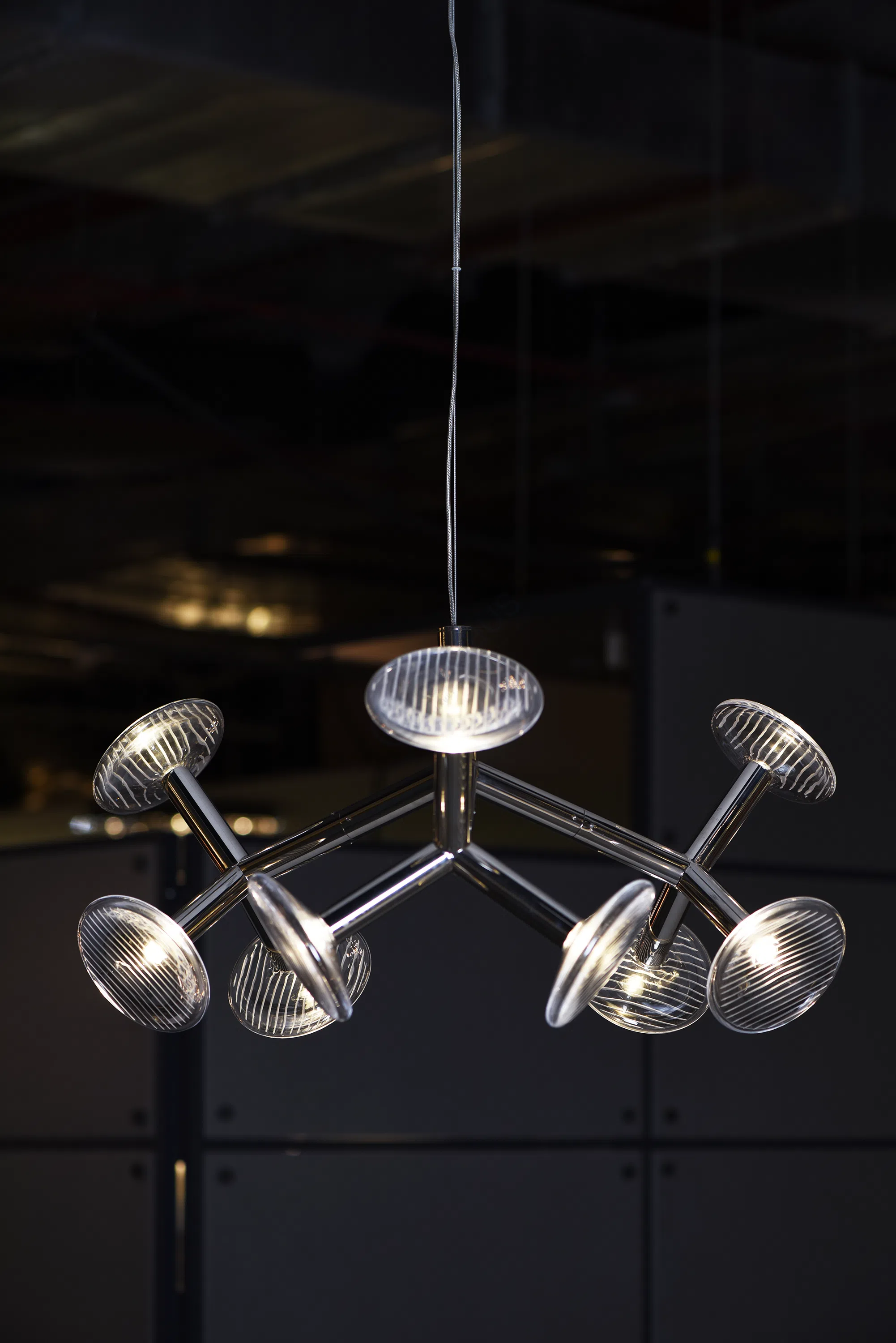 Основа светильника выполнена из прочных металлов – железа и алюминия, что обеспечивает надежность и долговечность конструкции. Цилиндрический элемент, скрывающий источник света, демонстрирует безупречное качество отделки. Главным украшением является стеклянный рассеиватель дискообразной формы, который не только мягко распределяет световой поток, но и обладает тонким внутренним рельефом, добавляющим визуальной глубины и уникальности.