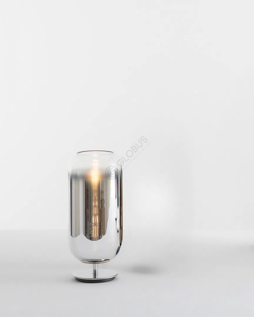 Его утонченная форма создает завораживающий эффект, где прозрачный внешний слой из стекла обрамляет внутренний металлический элемент. Свет, исходящий из центра, мягко рассеивается, отражаясь от полированной поверхности, что придает светильнику особую глубину и визуальную привлекательность.