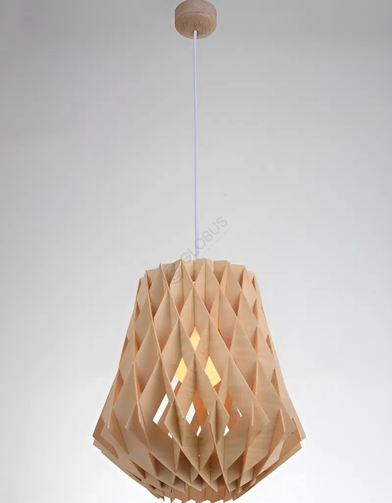 Этот подвесной светильник представляет собой изящное сочетание природной красоты и современного дизайна. Его абажур, искусно выполненный из тонких деревянных элементов, создает уникальную геометрическую структуру. Свет, проникая сквозь этот ажурный узор, формирует мягкие тени, наполняя пространство уютной атмосферой.