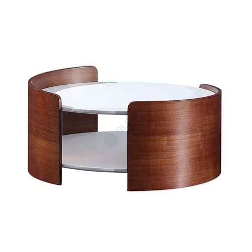 Материалы подчеркивают премиальный статус изделия. Благородный шпон с его уникальной текстурой и теплым оттенком обволакивает прочное основание из фанеры, обеспечивая долговечность и привлекательный внешний вид. Контраст с гладкими светлыми поверхностями полок придает столику дополнительную динамику и легкость.