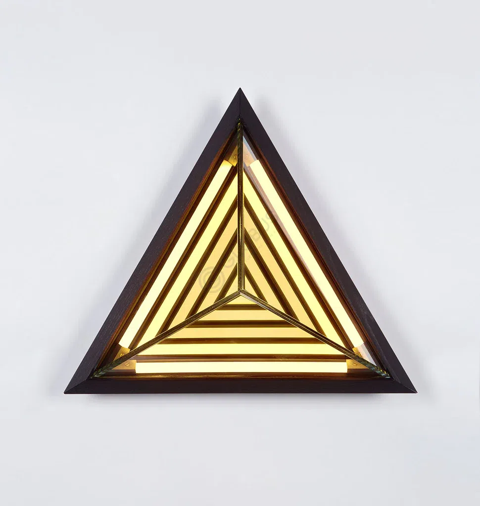 Каркас светильника выполнен из прочного металла, обрамляющего внутреннее пространство. Внутри расположены акриловые элементы, создающие эффектную игру света и тени. Эти вертикальные золотистые линии складываются в динамичный узор, напоминающий лучи или отражения, который при включении наполняет пространство мягким, теплым свечением. Такое сочетание материалов и форм подчеркивает высокий статус изделия и его принадлежность к премиум-сегменту.