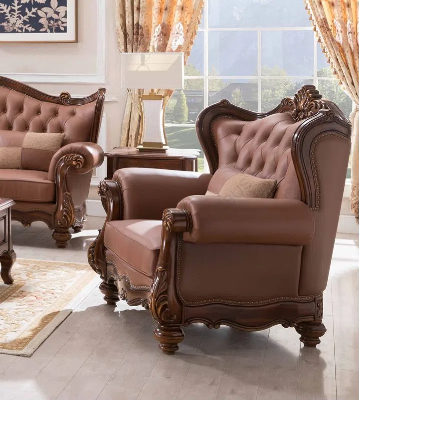 Каркас выполнен из натурального дерева, украшенного искусной резьбой. Эти элементы добавляют силуэту дивана выразительности и подчеркивают его классический характер. Роскошная кожаная обивка теплого оттенка приятна на ощупь и обладает превосходной долговечностью.