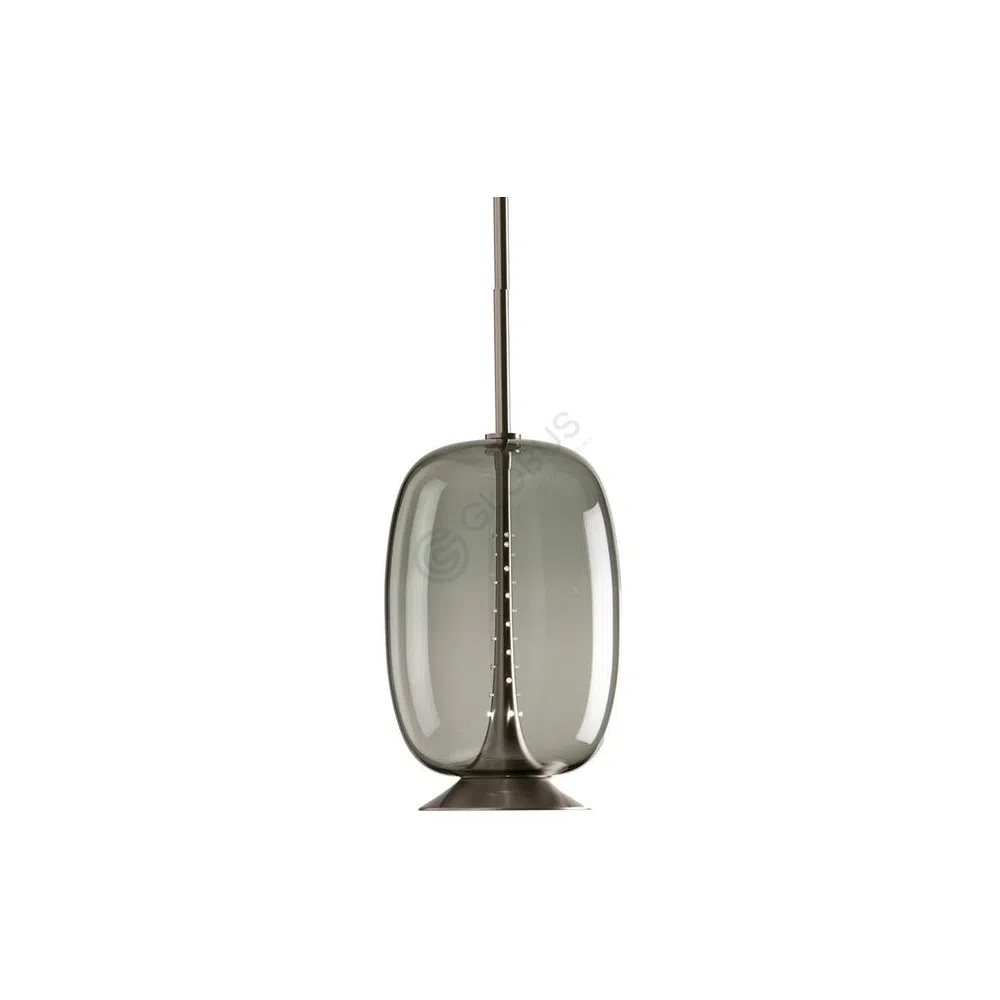Основание светильника выполнено из тонкого стекла с дымчатым оттенком, придающим ему глубину и визуальную легкость. Сквозь прозрачные стенки проступает изящный металлический стержень, который соединяется с устойчивым металлическим постаментом. Сочетание этих материалов демонстрирует безупречное качество исполнения и внимание к деталям.