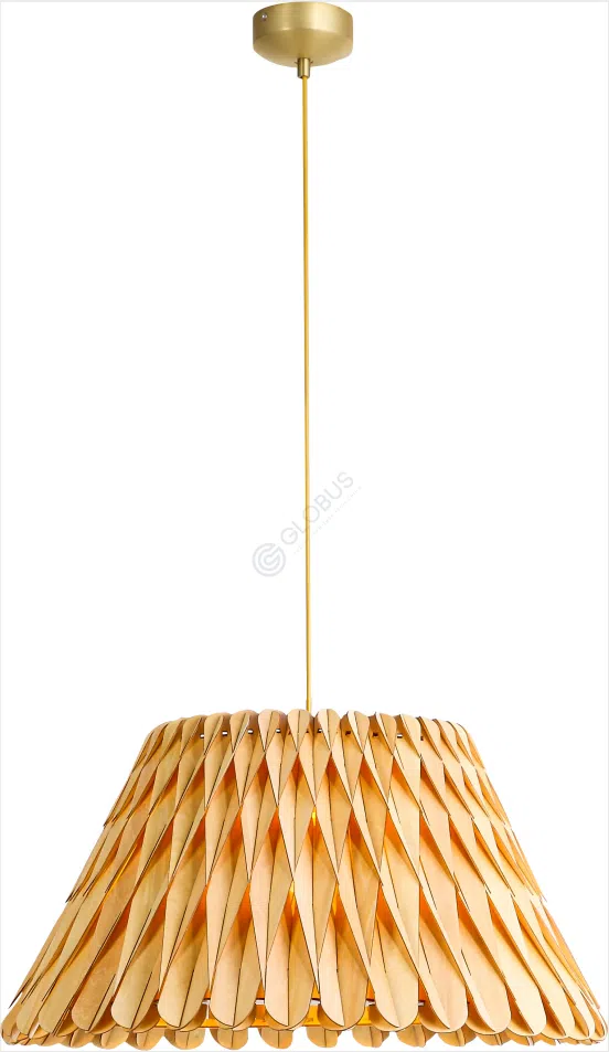 Основной акцент сделан на плафон, выполненный из множества пластин натурального дерева. Эти элементы искусно изогнуты и уложены, формируя уникальный, объемный узор. Такая конструкция позволяет свету мягко рассеиваться, создавая уютное и теплое освещение, идеальное для вечернего отдыха или работы. Текстура древесины придает каждому изделию неповторимый характер.