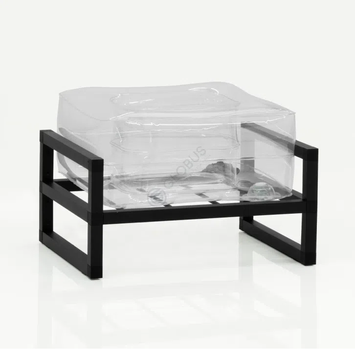Основной элемент сиденья и спинки выполнен из качественного ПВХ, формирующего необычную надувную структуру. Этот материал подчеркивает инновационность подхода и придает объекту выразительный характер. Прозрачная поверхность позволяет свету свободно проникать сквозь кресло, делая его визуально невесомым.