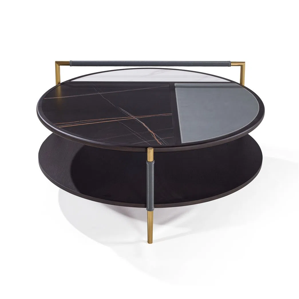 Верхняя круглая столешница является центром притяжения, демонстрируя искусное соединение различных материалов, включая изысканный спеченный камень с уникальным рисунком. Нижняя полка, выполненная из натурального дерева, предлагает дополнительное пространство для хранения или демонстрации любимых предметов. Этот столик станет не просто функциональным элементом, но и выразительной деталью, подчеркивающей ваш вкус.
