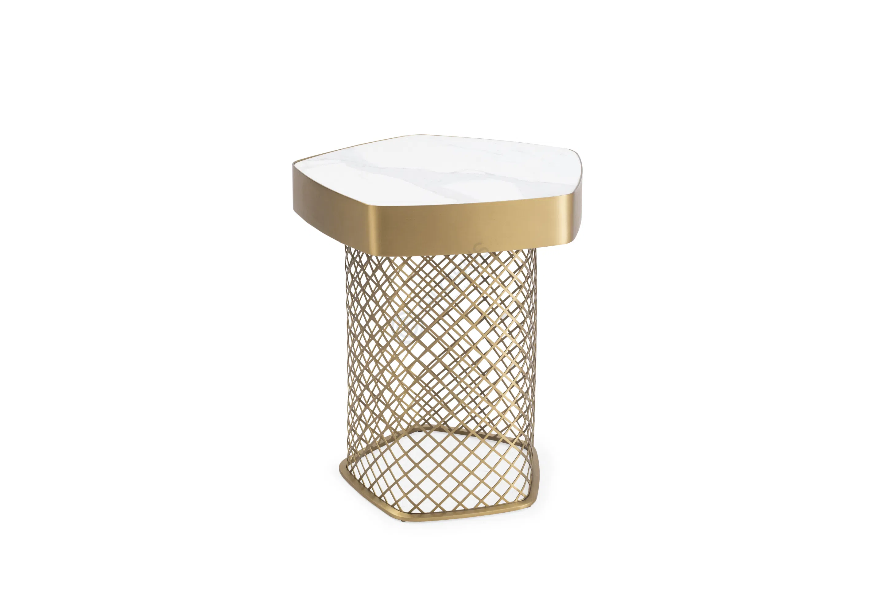 Полки расположены на разных уровнях, предлагая пространство для книг, декоративных элементов или коллекций. Центральная часть стеллажа украшена декоративной сеткой, которая добавляет визуальный интерес и обеспечивает циркуляцию света. Сочетание открытых полок и текстурированной вставки создает динамичный образ.