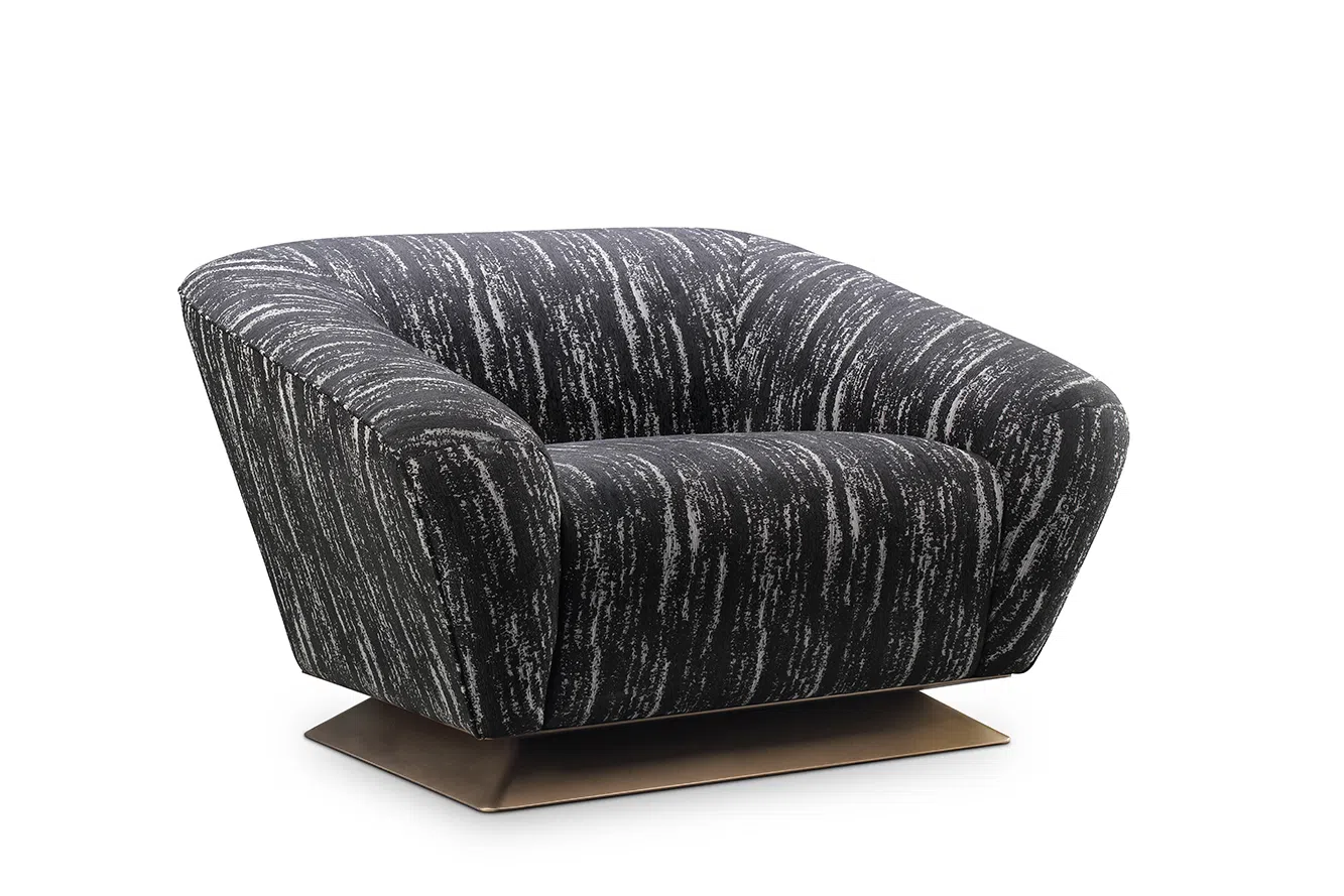 Дизайн этого предмета мебели отличается утонченной проработкой: вертикальные складки на спинке и боковинах придают объем и игру света, а также подчеркивают плавные линии изделия. Элегантное основание из полированной нержавеющей стали, выполненное в золотистом оттенке, выступает в роли уверенной и стильной опоры, завершая образ и добавляя нотку роскоши.