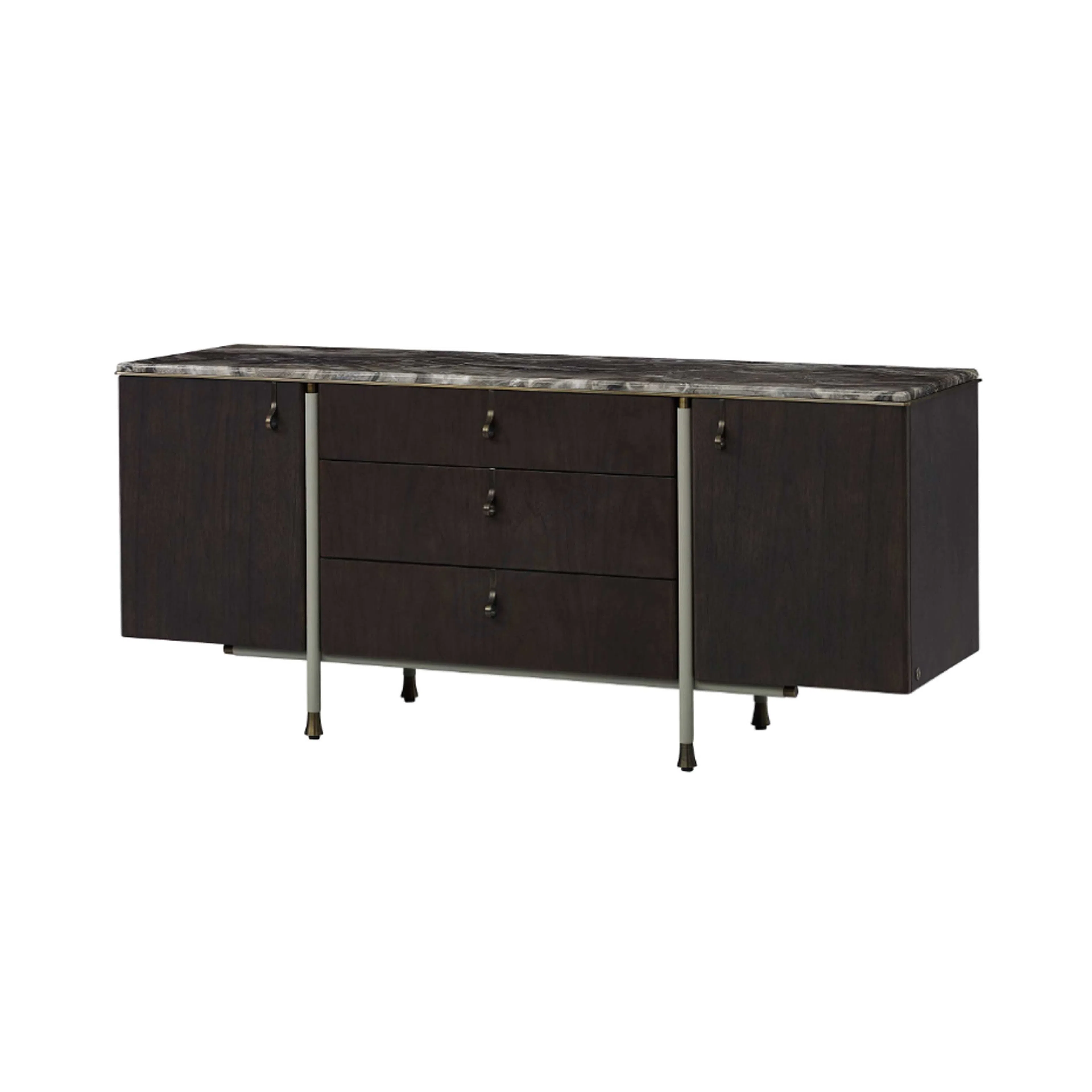 ТВ тумба в современном стиле сочетает в себе лаконичность форм и благородство натуральных материалов. Столешница выполнена из отборного мрамора, что придает конструкции выразительность и подчеркивает статус интерьера. Корпус из шпона и фанеры гармонично дополнен элементами из нержавеющей стали — такой дуэт подчеркивает продуманный дизайн.
