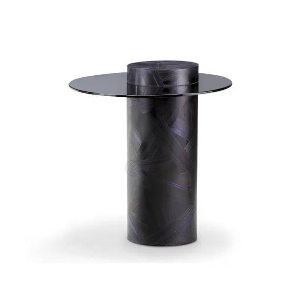 Журнальный столик с выразительным круглым силуэтом сочетает тонкую тонированную столешницу и монолитное цилиндрическое основание. Возвышающийся над плоскостью акцентный диск формирует динамичную композицию и задает ритм современному интерьеру гостиной.