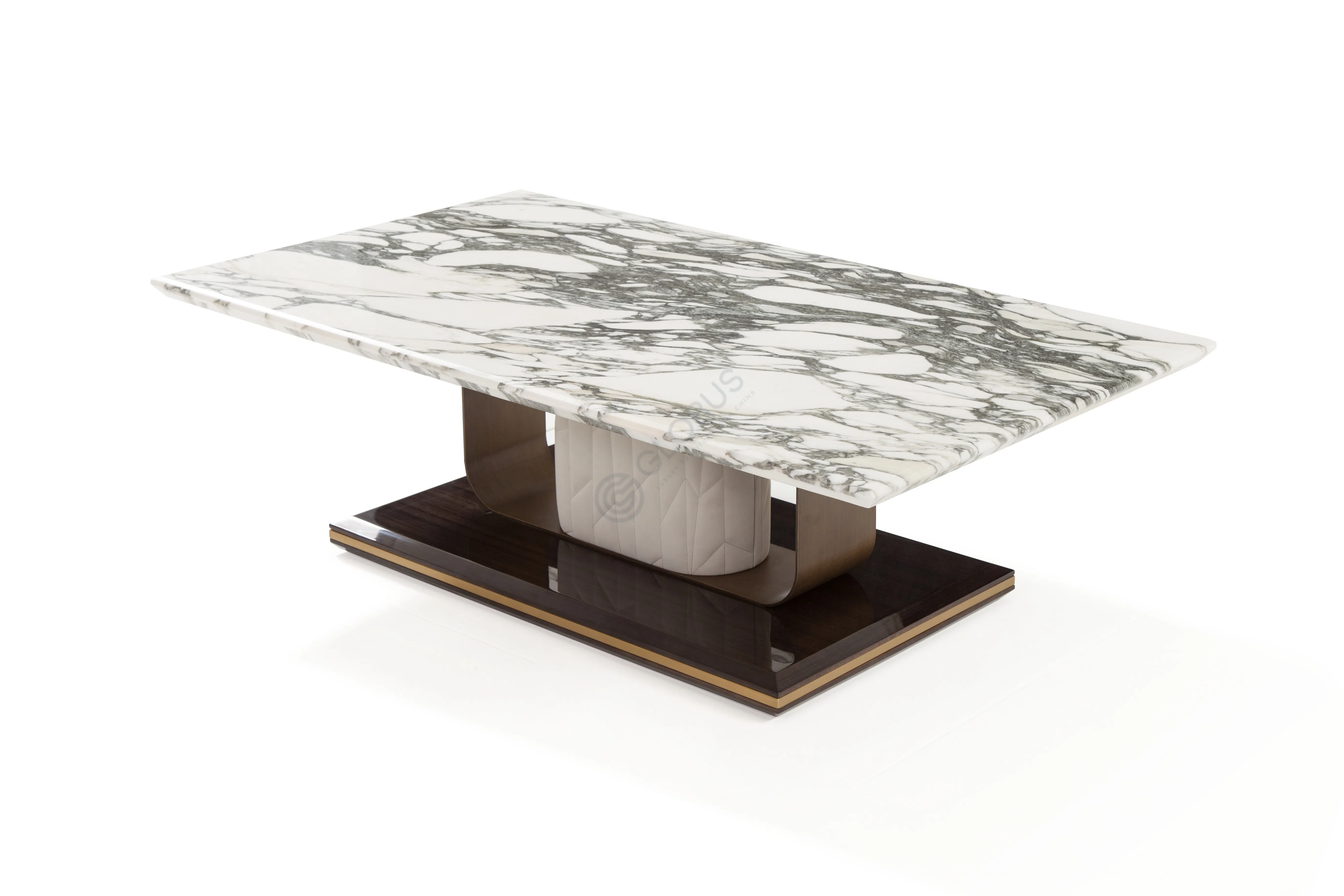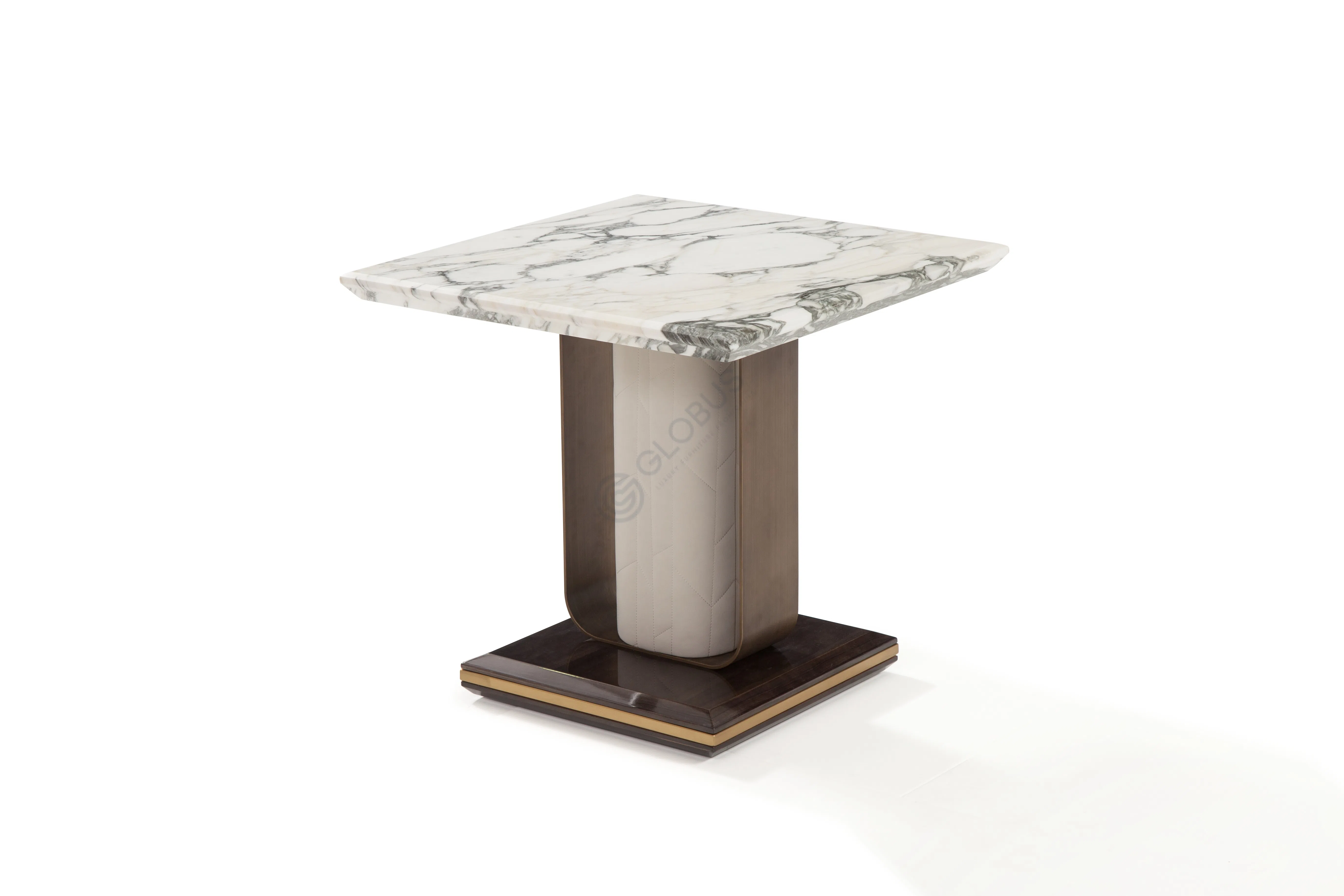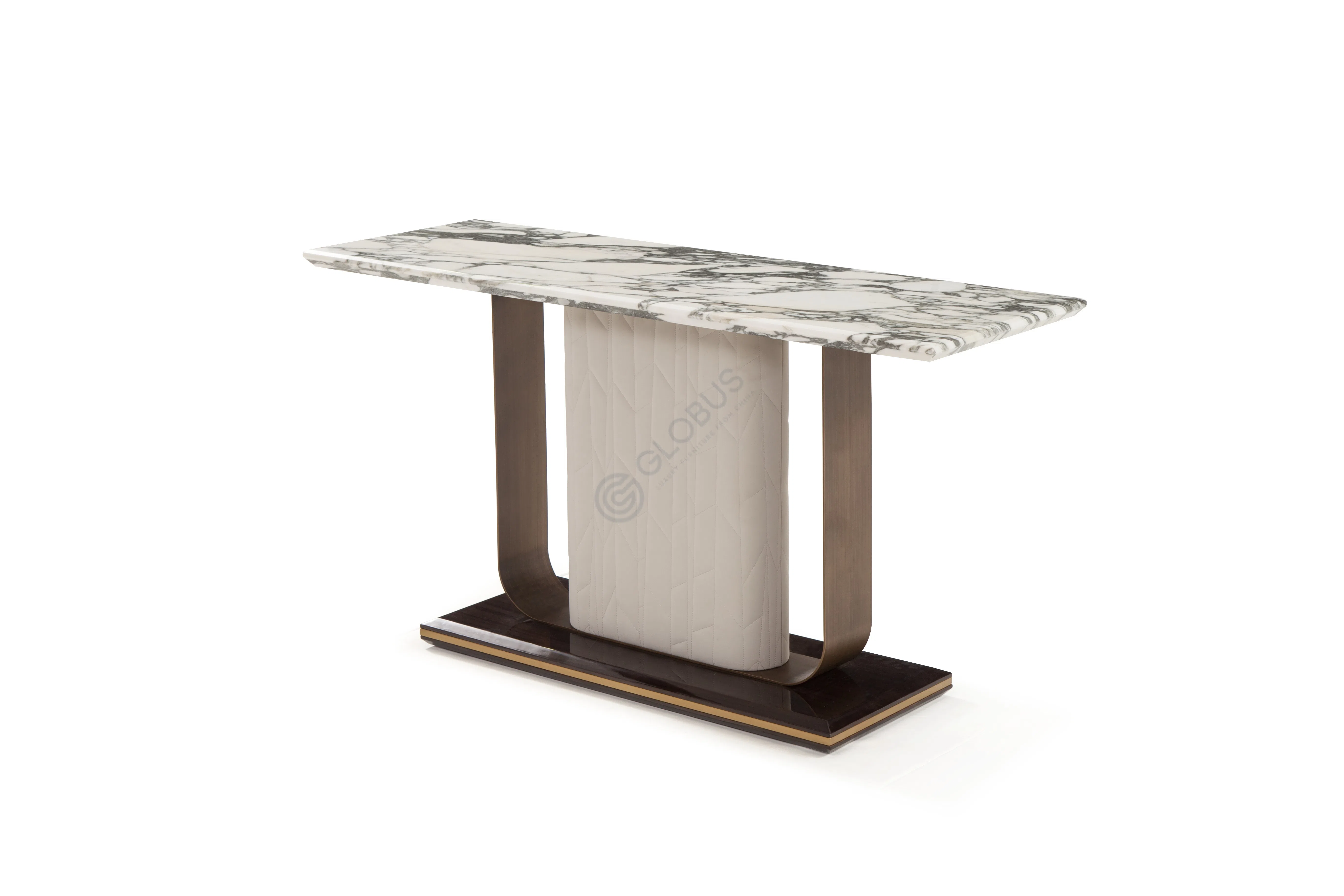 Столешница выполнена из великолепного натурального мрамора, чья уникальная текстура и прожилки придают поверхности неповторимый узор, делая каждый экземпляр особенным. Основание представляет собой гармоничное сочетание материалов: центральная опора из элегантного натурального мрамора обрамлена изогнутыми металлическими элементами из нержавеющей стали, которые покоятся на устойчивой платформе, облицованной шпоном высокого качества, поддержанной прочной фанерой.