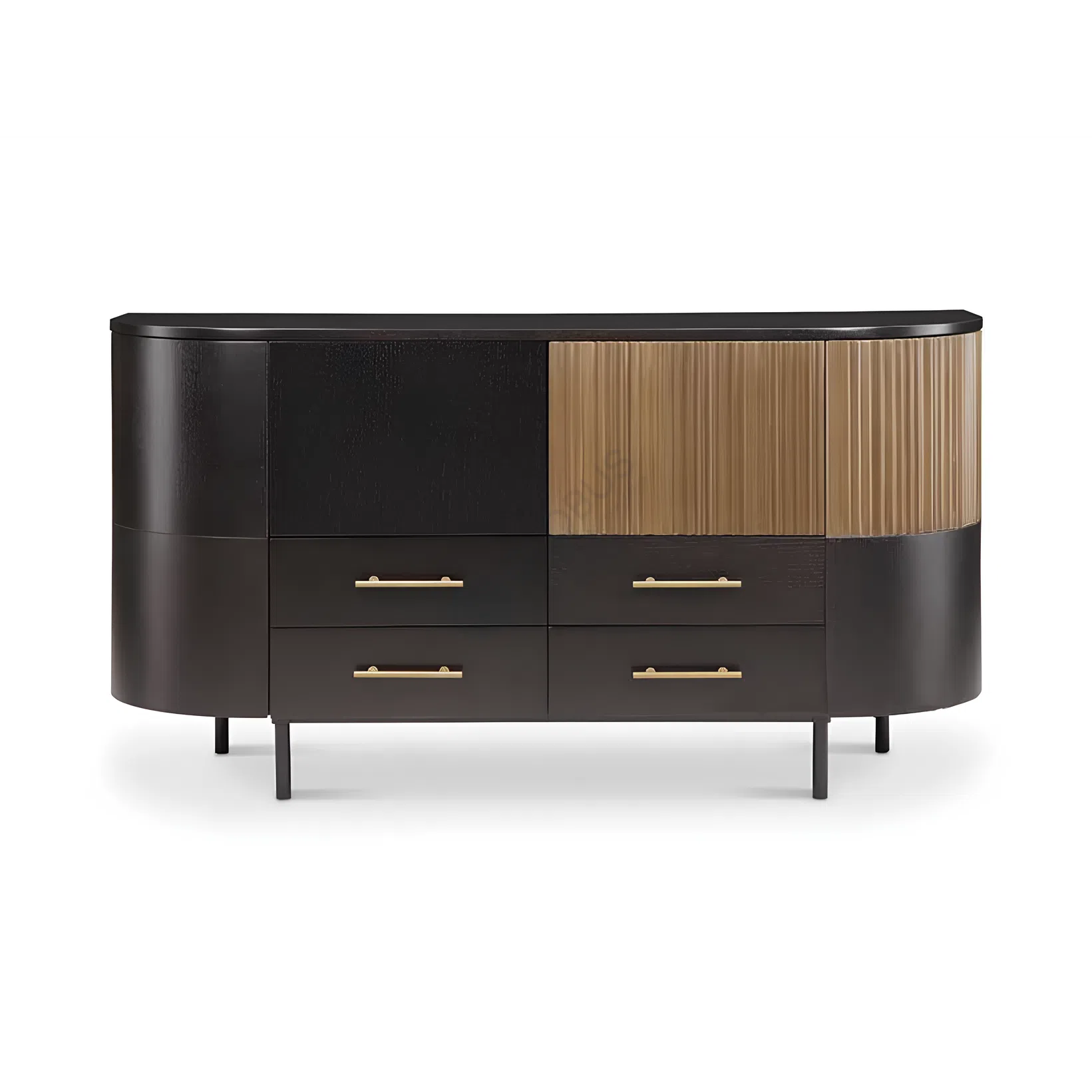 Корпус сочетает массив и МДФ для прочности и стабильной геометрии. Латунные ручки подчеркивают графику линий, ножки из нержавеющей стали с темным покрытием добавляют легкости и визуально приподнимают форму.