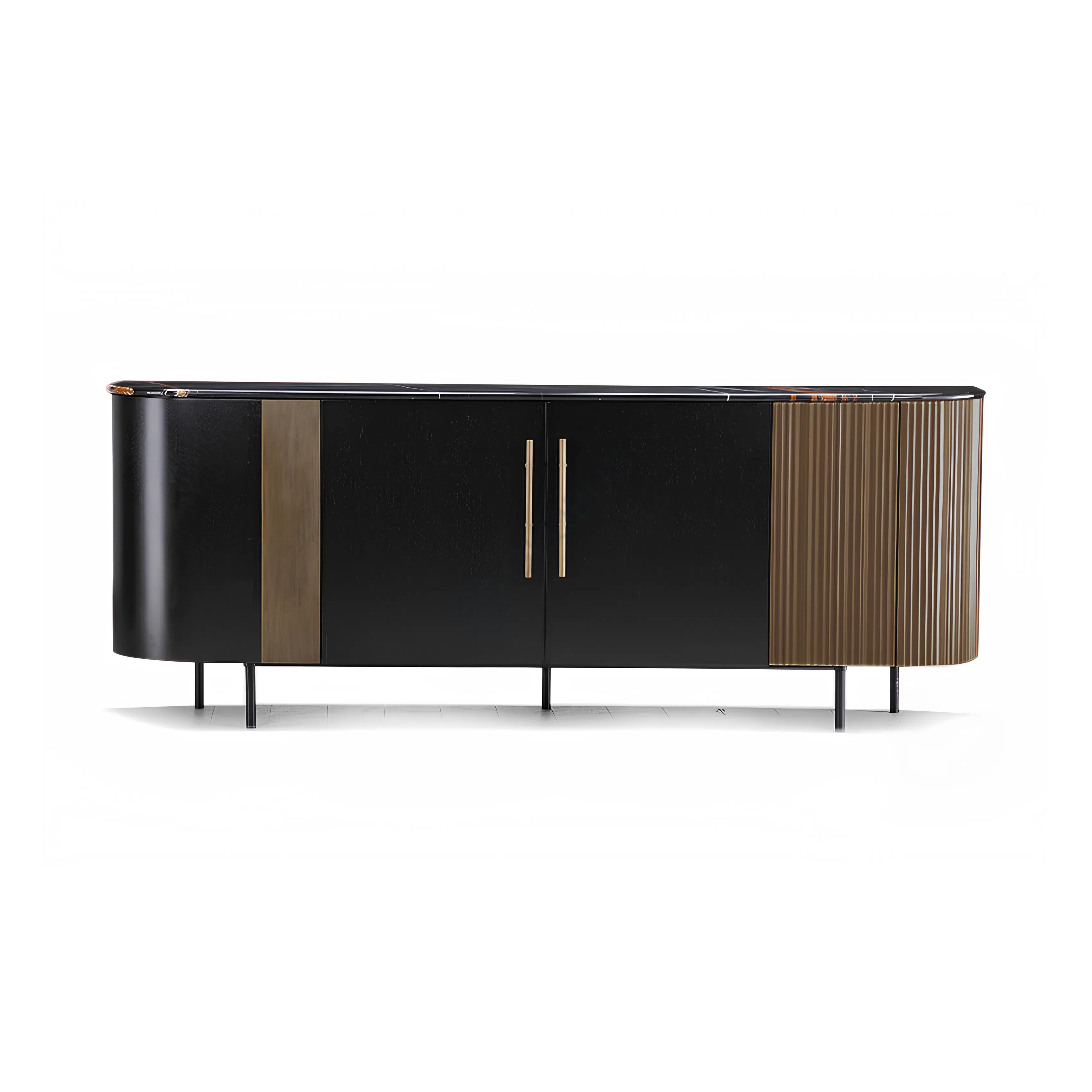 ТВ‑тумба в современном стиле с вытянутым силуэтом и мягко скругленными торцами. Верхняя плоскость выполнена из мрамора глубокого оттенка, а торцевые фасады украшены ритмичным вертикальным рифлением теплого металла. Центральная часть отделана темным деревом, объем уравновешен тонкими опорами.