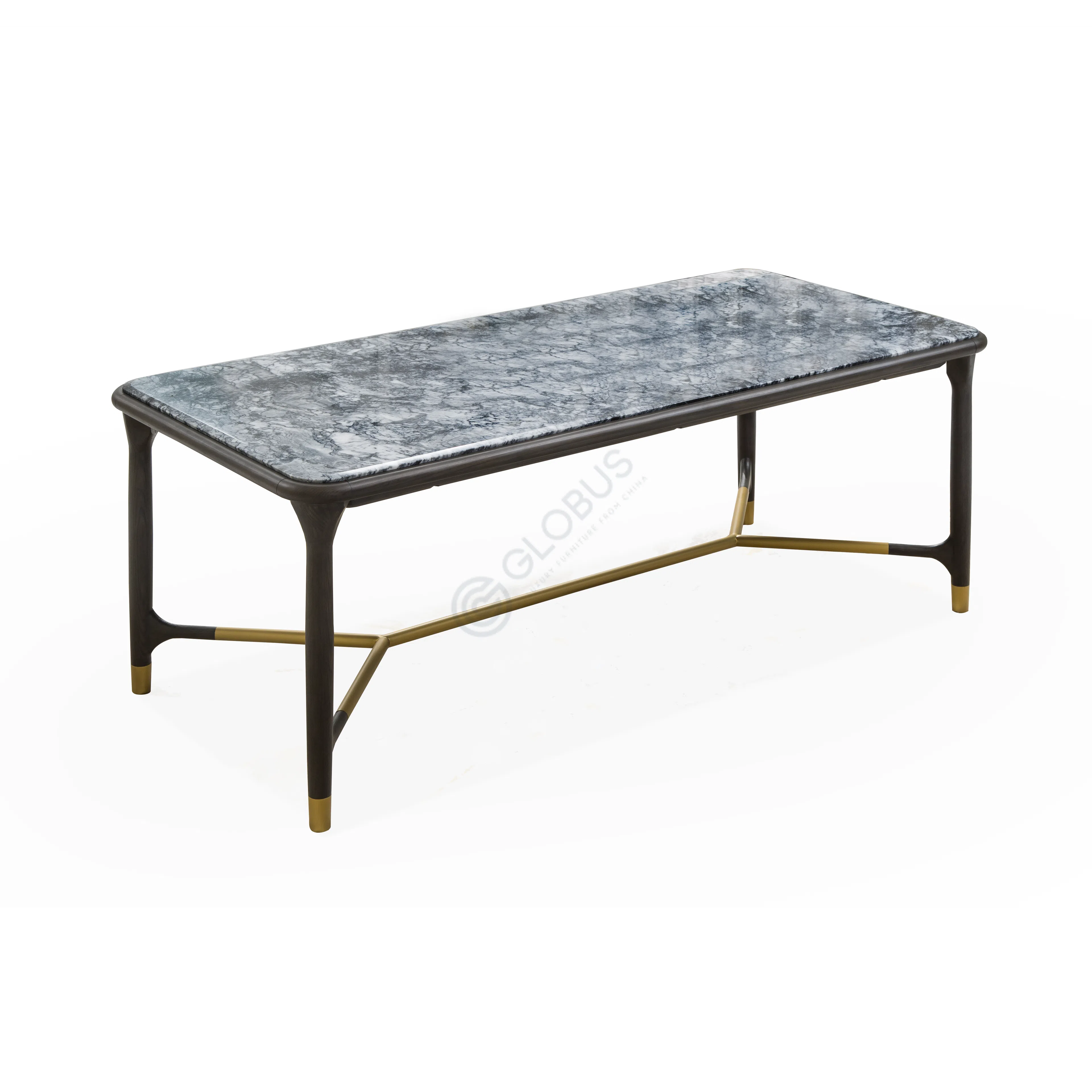 Столешница выполнена из натурального мрамора, демонстрируя уникальный рисунок и текстуру природного камня. Этот благородный материал идеально дополняет каркас, изготовленный из натурального дерева и акцентированный элементами из нержавеющей стали с покрытием под латунь. Искусное сочетание материалов придает изделию особый шик.