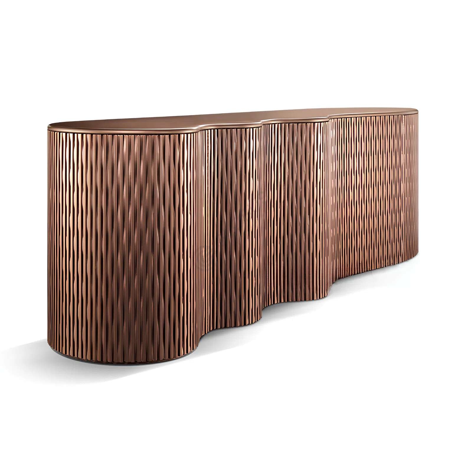 Центральным элементом является круглая столешница из природного мрамора, чьи уникальные узоры и нежные прожилки придают ей неповторимый характер. Гладкая, прохладная поверхность приглашает к прикосновению, а тонкий медный элемент, деликатно интегрированный в центр, добавляет особую утонченность. Основание стола изготовлено с использованием натурального дерева для прочности и покрыто искусной рельефной фактурой из железа, создающей эффект тонкой волны.