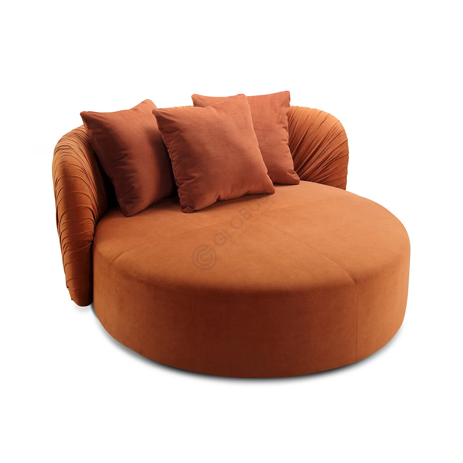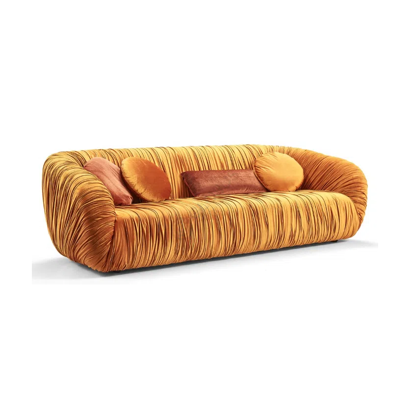 Обивка выполнена из высококачественного текстиля с приятной на ощупь текстурой. Особую выразительность модели придает деликатная плиссировка, которая изящно подчеркивает изгибы спинки и подлокотников. Это детальное исполнение говорит о мастерстве и внимании к каждой линии.
