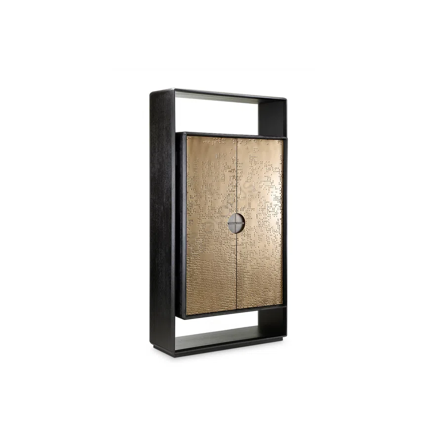 ТВ-тумба с графичным корпусом из натурального дерева в глубоком черном тоне объединяет современную лаконичность и изящество ар-деко. Акцентный фасад из нержавеющей стали с декоративной перфорацией и круглой врезной ручкой мягко отражает свет и придает композиции выразительность.