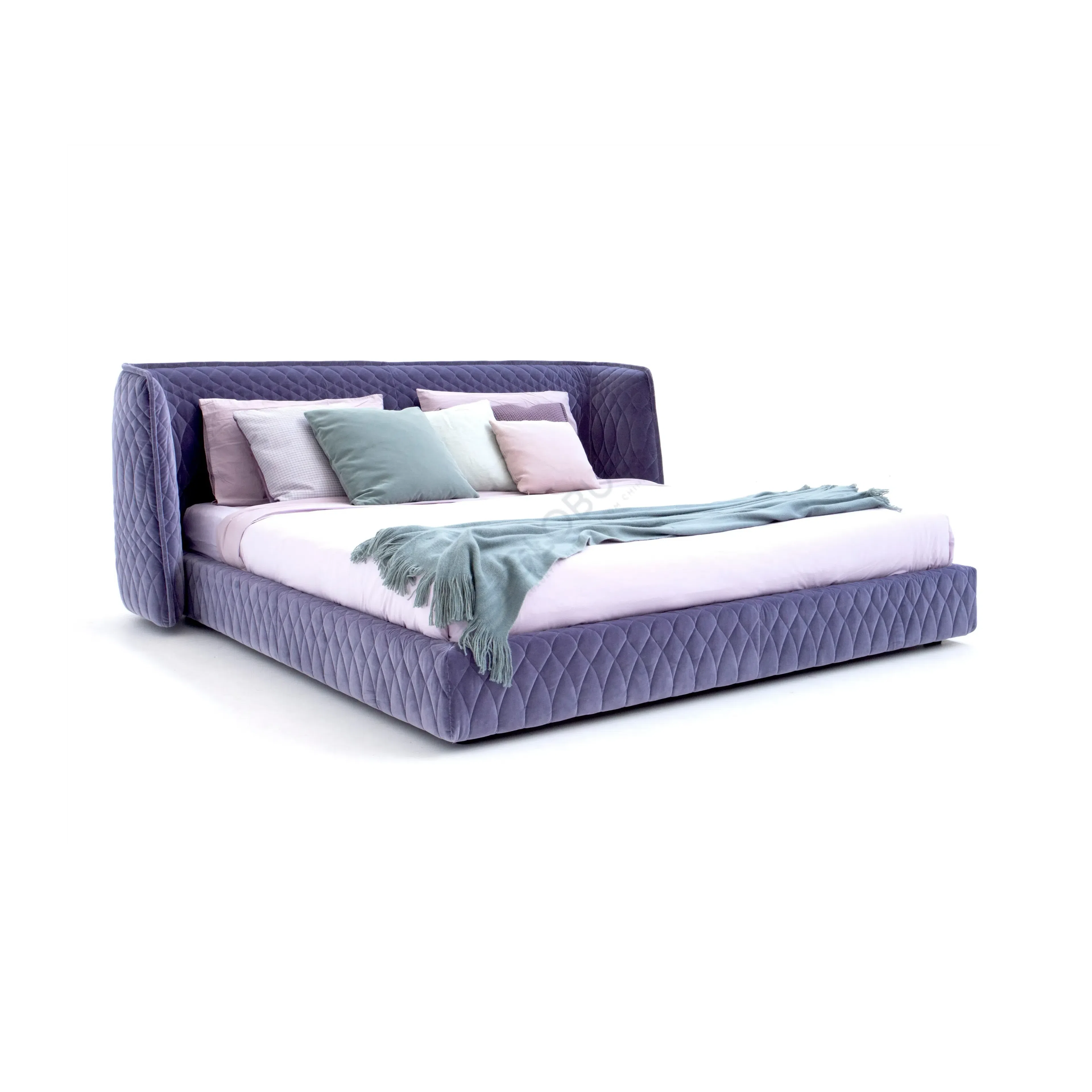 Кресло с округлым силуэтом и глубоким сиденьем подчеркивает эстетику современного интерьера. Обивка из мягкого текстиля украшена объемной стёжкой с чередованием ромбов и овальных мотивов, создавая выразительный ритм и приглушенную игру света на спокойном сером оттенке.