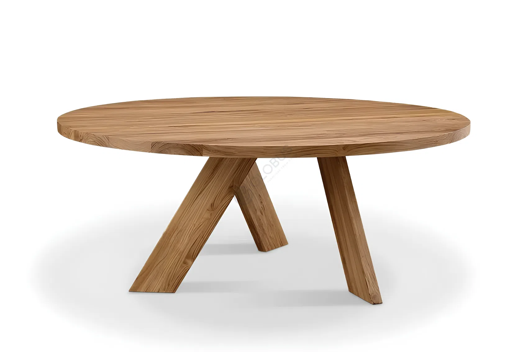Угловой столик из натурального дерева в современном экостиле с лаконичной круглой столешницей и выразительной трехопорной базой. Живая текстура массива подчеркивает чистую геометрию и придает предмету теплый, естественный характер.